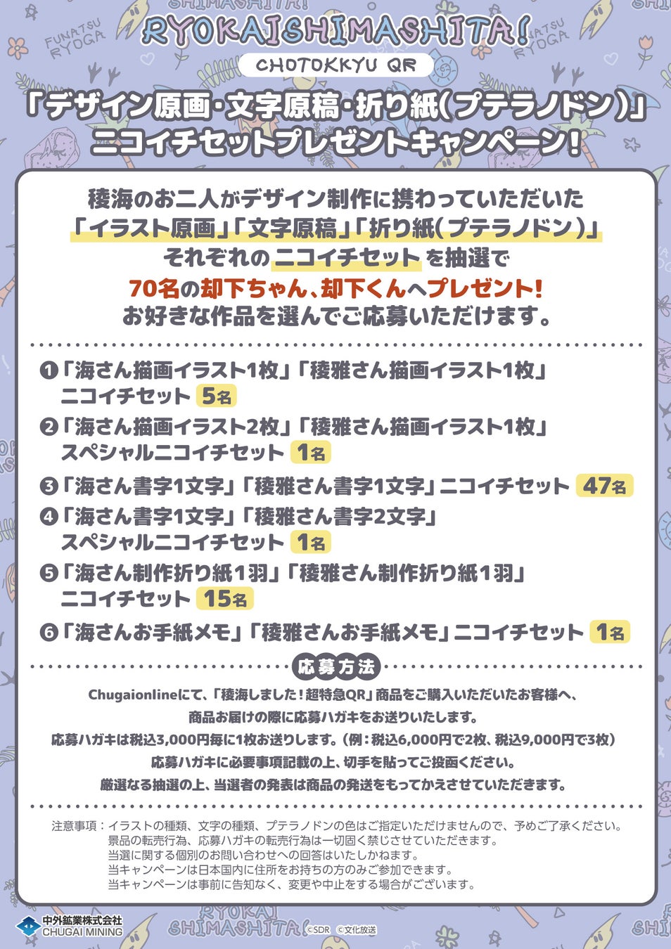 Chugaionlineにて、「稜海しました!超特急QR」関連商品を税込3,000円ご購入ごとに応募ハガキを1枚お送りいたします。
