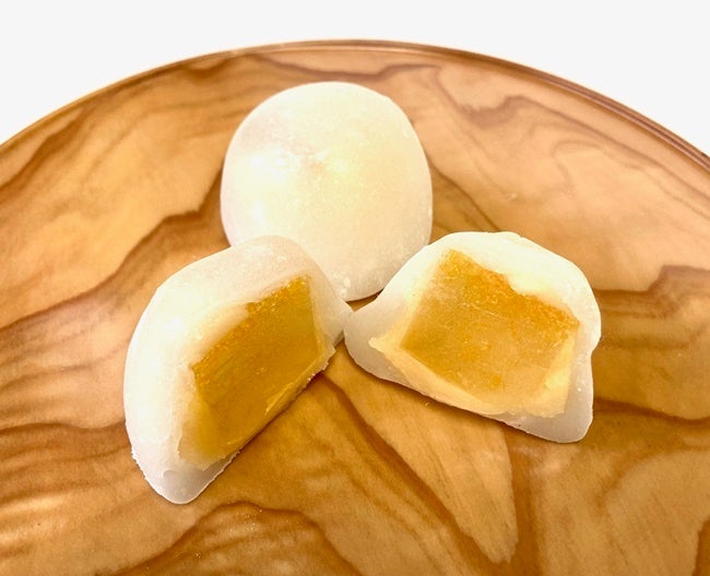 寒天で作ったグミ食感のみかんゼリーをみかん餡で包み、大福にしました。新しい感覚のみかん大福です。