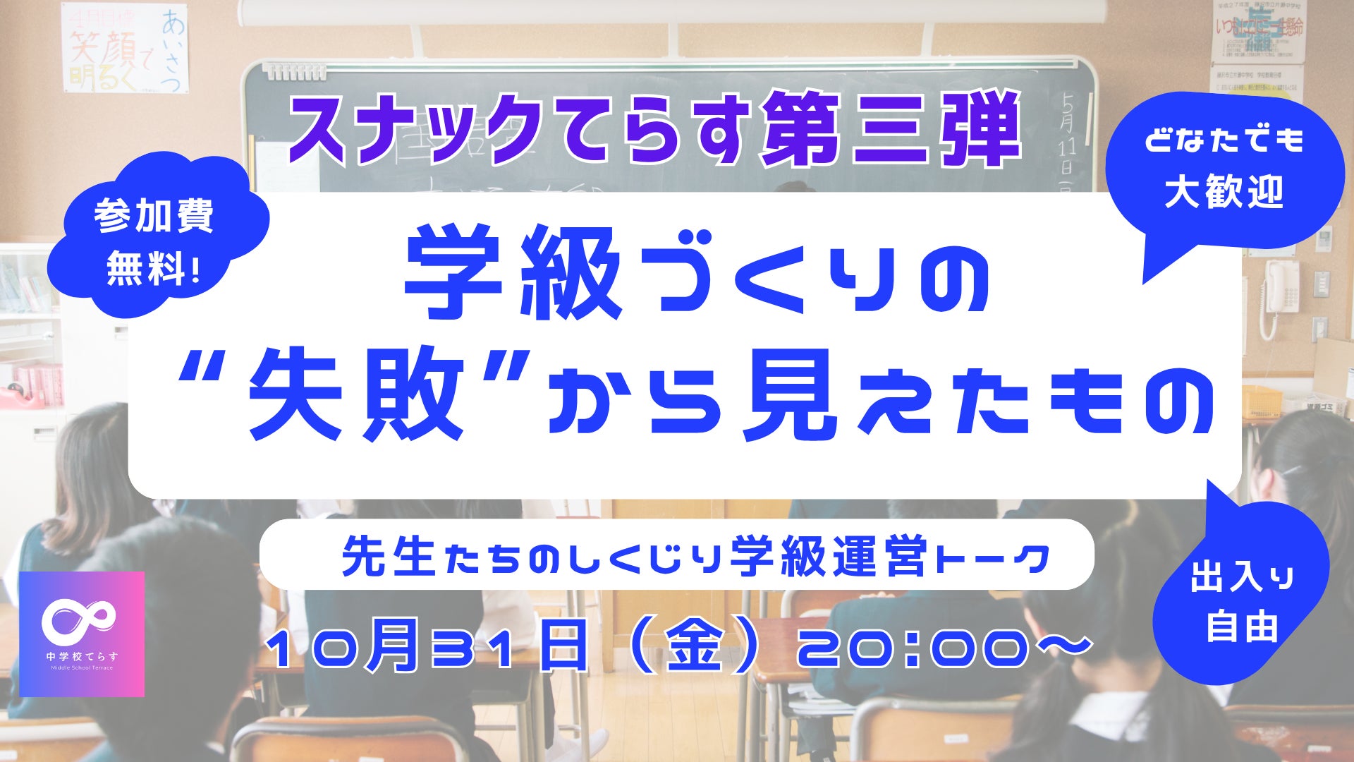 【10月31日(金)開催 】「スナックてらす 第三弾」学級づくりの“失敗”から見えたもの〜先生たちのしくじり学級運営トーク〜