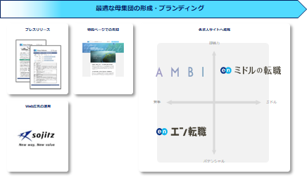 プレスリリースや特設ページ、Web広告での告知に加え、各求人サイトでの集客サポートを実施いたします。『エン転職』『AMBI』『ミドルの転職』とターゲットの異なる3つの求人サイトを活用することで、ターゲットへ網羅的に求人を届けます。