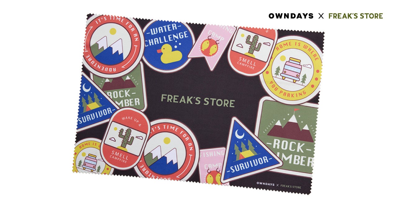 つけたり外したりすることが多いサングラスなので、付着した指紋や汚れが拭き取りやすいよう、OWNDAYSの通常サイズの約2倍でご用意しました。FREAK’S STOREらしいカラフルなデザインに仕上げています。