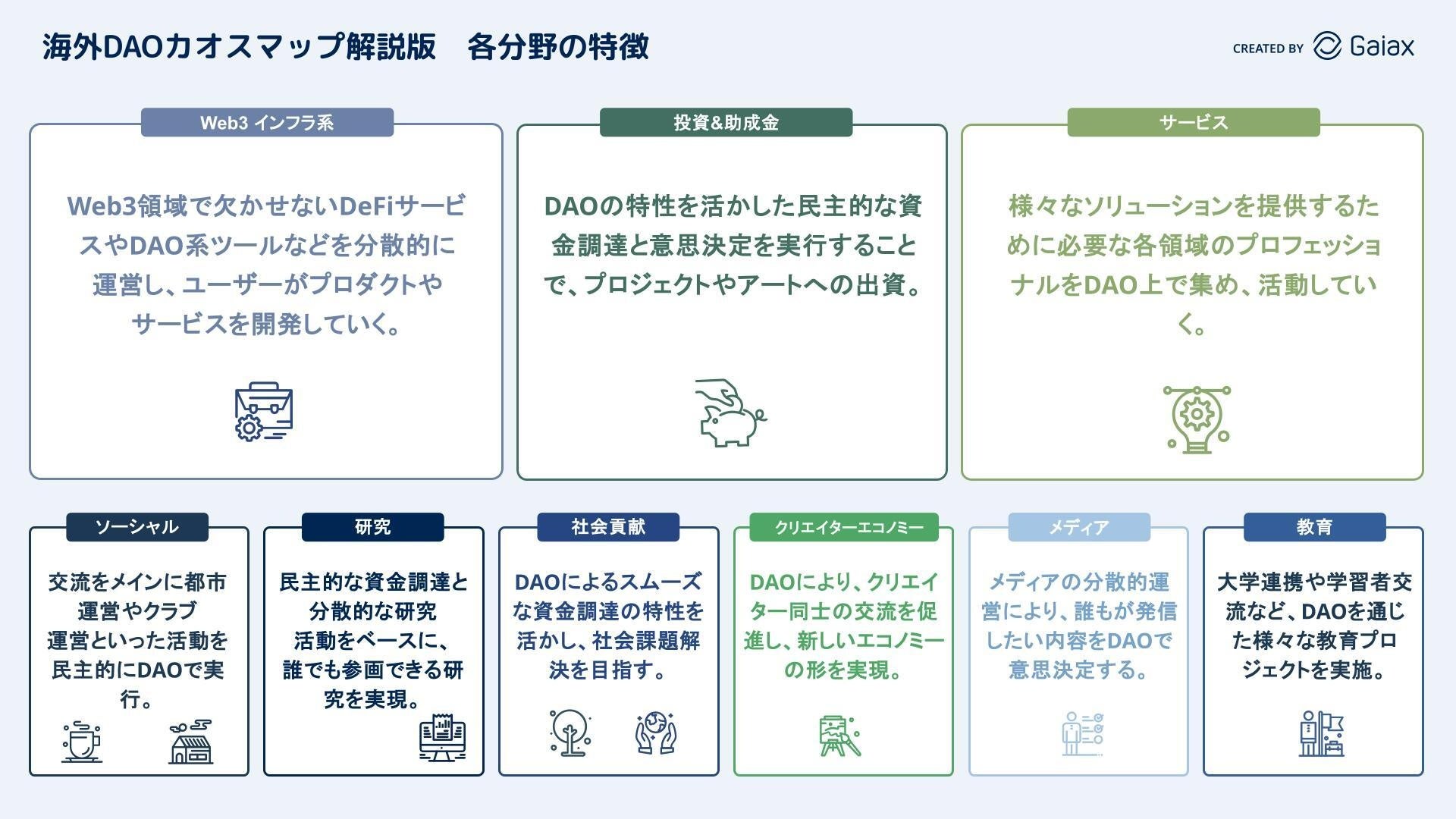 国内DAOと比較し海外DAOの特徴は、暗号資産の活用による参加者数と資金規模において大規模かつ専門性の高い活動をしているDAOが多いことです。その結果、海外DAOの主要3分野は、国内DAOにはないプロフェッショナルな分野となっています。各カテゴリの特徴と国内との違いは以下の通りです。