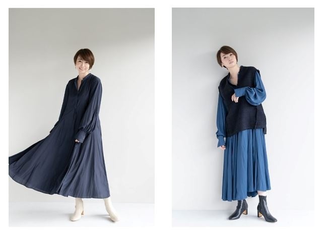 サテンドレスはナチュラルなシワ感とマットなツヤで通年着用に最適なポリエステル素材。裾にかけてやわらかに揺れるシルエットで着るだけで高揚感のある一着に仕上がりました。
