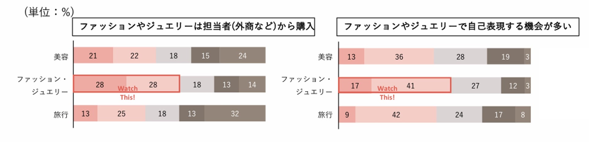 「ファッション・ジュエリークラスタ」は普段は自ジャンルに予算を集中投下している傾向があり、直近では海外旅行への関与は低めという結果が出ました。彼女たちの約56%がファッションやジュエリーは「担当者(特定の店員や外商など)を通じて購⼊する」と回答。また約58%が「ファッションやジュエリーで自己表現する機会が 多い」と答え、購⼊時に自分の個性や⽴場を理解してもらいつつパーソナライズされ たコミュニケーションを好む傾向が見えました。