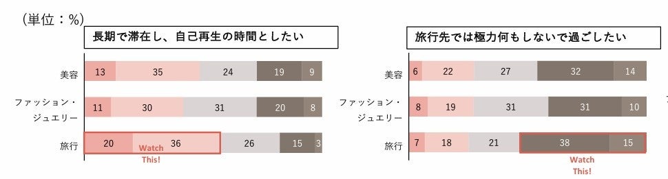 「旅行クラスタ」は美容やファッションに支出は抑えめ。美容クラスタと同程度の予算で国内旅行をおこなっていますが海外旅行の予算は突出しています(年額約188 万円)。彼女たちの約56%が「⻑期で滞在し自己再⽣の時間としたい」と回答。他クラスタよりも⻑期滞在を好み、「旅行先では極⼒何もしないで過ごしたい」という設問に対し約53%が「あまりあてはまらない」「まったくあてはまらない」と回答し、旅行クラスタは⻑期滞在かつアクティビティ志向でした。