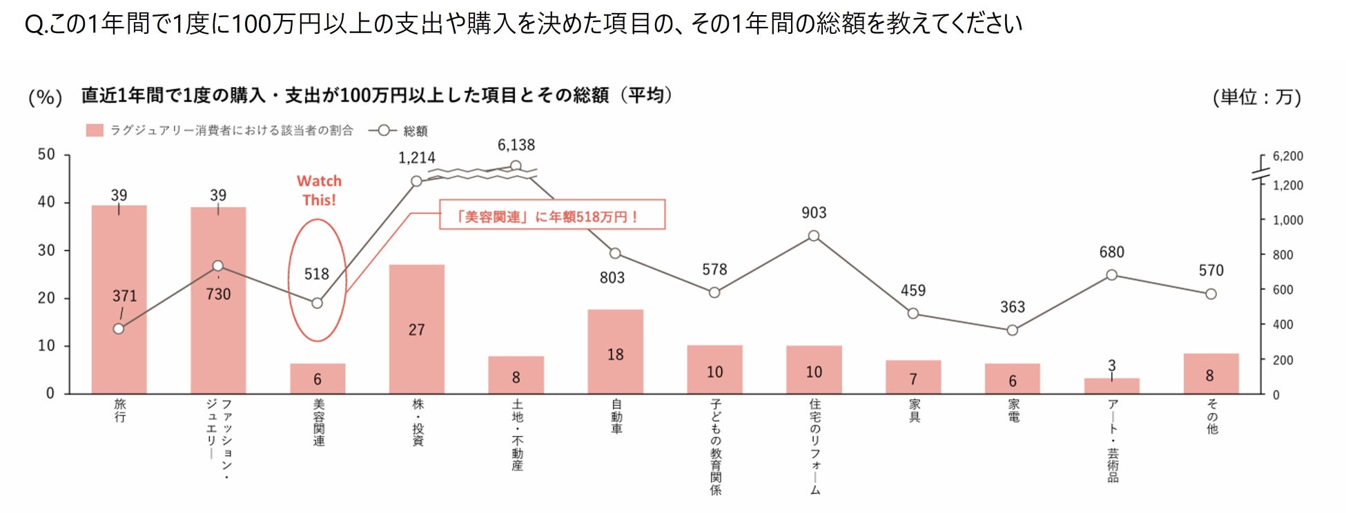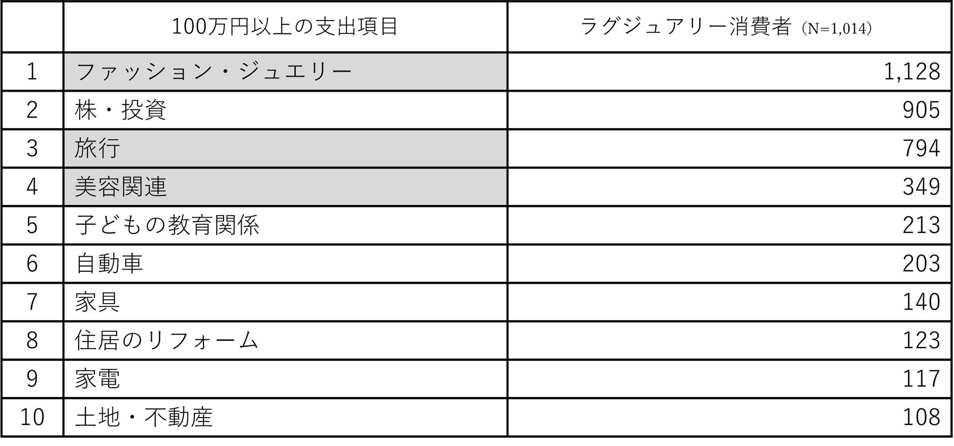 以下は、1年以内の間にラグジュアリー消費者たちが100万円以上の支出をした回数をランキングにしています。今回の調査のメインテーマである「ファッション・ジュエリー」では1,128回、「旅行」では794回、「美容関連」では349回。そして、その他にも「株・投資」「子どもの教育関係」や「自動車」や「家具」など、多様な項目で1度に100万円以上を支出している様子がうかがえます。