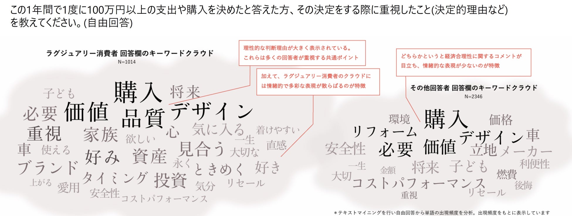 100万円以上の高額消費を決定する際に重視したことは何かという設問に対する自由回答で、ラグジュアリー消費者のコメント欄には、まず「価値」「デザイン」「品質」など合理的な理由が多く、「ときめく」「好み」「心」などの情緒的な理由も語彙豊かに多種類見られました。ラグジュアリー消費者の高額消費の動機は理性的であると同時に、感性による多彩な表現で綴られています。