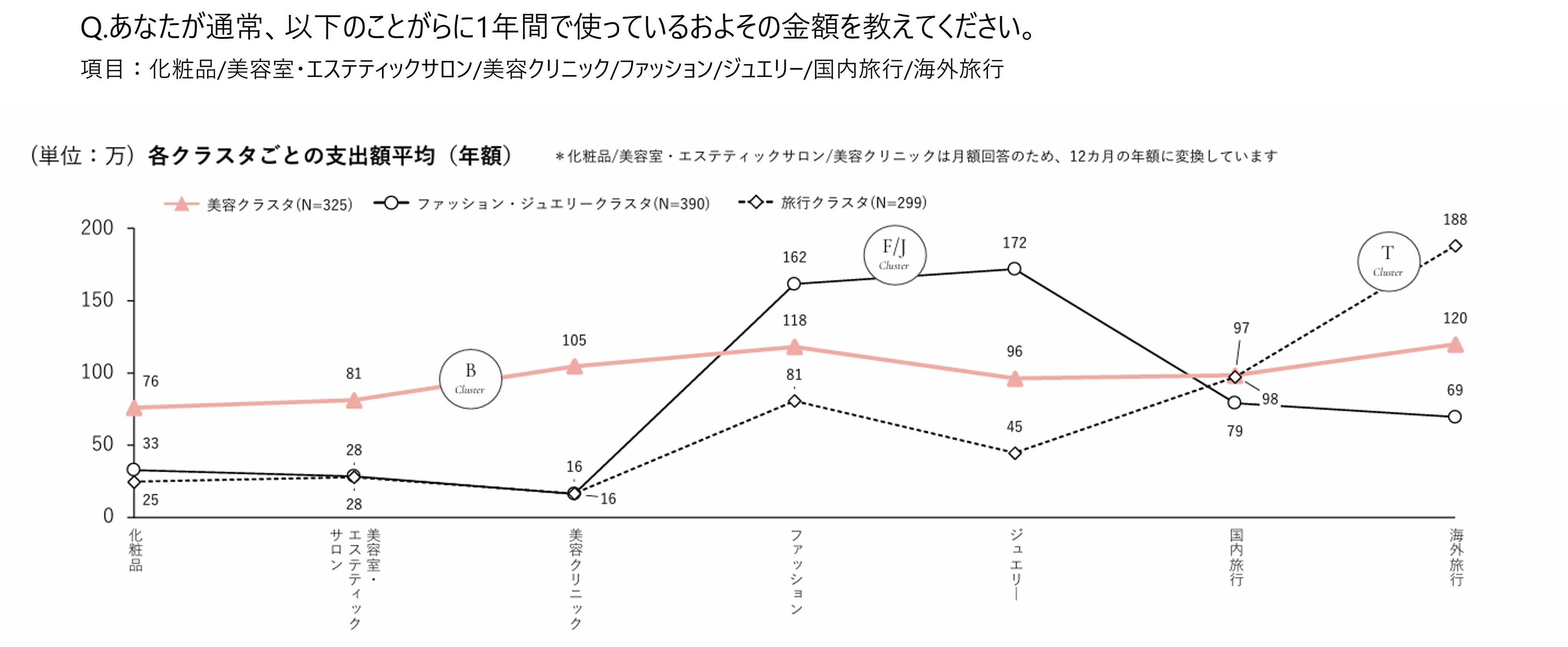 「美容クラスタ」は普段づかいでも美容関連への支出が他クラスタより高く、その他の各項目でもバランスよくハイレベルの支出をキープしていることがわかりました。彼女たちは美容、美容関連(下表:化粧品・美容エステサロン・美容クリニック)に月平均約22万円を投じています。
