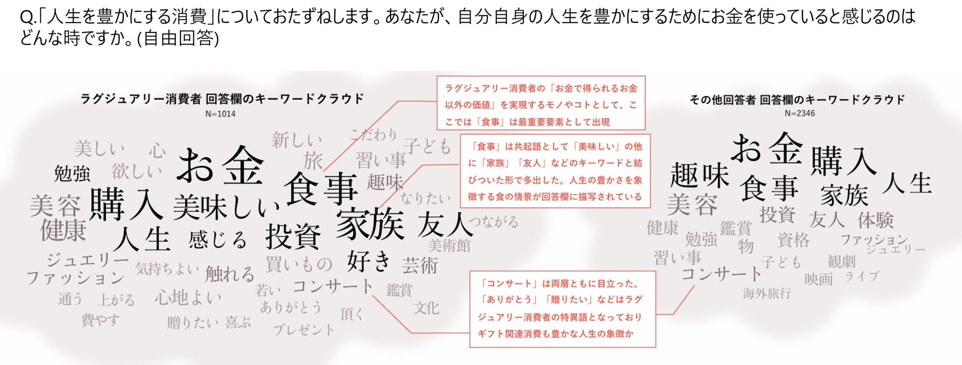 “あなたにとって⼈⽣を豊かにする消費とは?”という設問に対してラグジュアリー消費者の回答は自己表現、向上心や社会的ステイタスの実現、美と健康の追求、日常からの離脱への欲求などに由来する多彩なコメント欄となっていました。特に「食事」は「家族」「友人」と「美味しい」の結びつきが強く、家族や友人との時間を大切にしている様子がうかがえました。