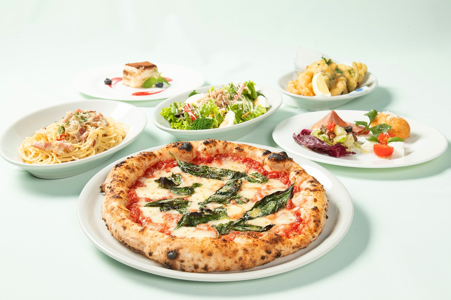 ドリンク、サラダ、前菜盛り合わせ、埼玉野菜のフリット、本格薪窯ナポリピッツァ&パスタ、ティラミスまで楽しめる3周年記念限定コース。2名様からご注文可能です。