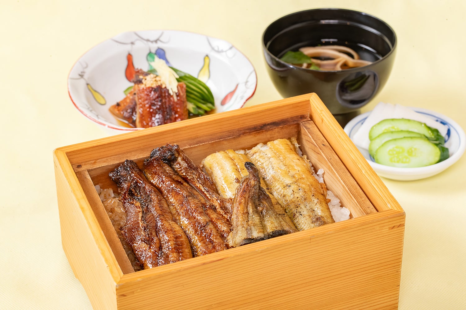 蒸さずに焼く関西風の鰻は、皮がパリッと中はふっくらと焼き上がった自慢の逸品。特別に蒲焼き、白焼きを一つのお重に組合せ、鰻と胡瓜の酢の物うざくも付けました。