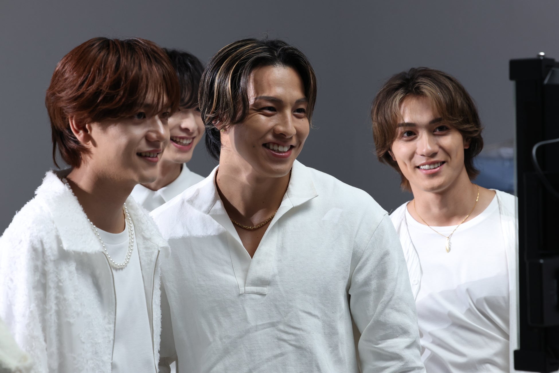そして6人が揃う集合カットの撮影へ。中島颯太さんは「なかなか無いメンバーで皆揃ってのCMは楽しみですね」とコメントするなど、新鮮なメンバー編成にワクワクされている様子。合間には、RIKUさんが「食らえ!慧ちゃん!」とスタイルエレブラシを木村慧人さんの首元に当ててふざけるシーンも見られるなど、仲の良さが垣間見える、和やかな現場となりました。クランクアップ後にはスタッフからサプライズで花束が贈られ、温かな拍手の中で撮影は締めくくられました。