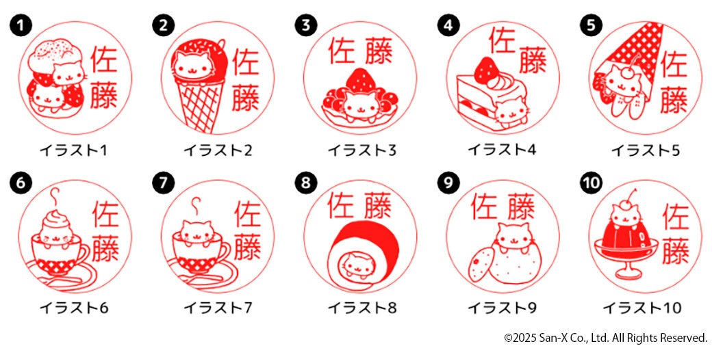 かわいすぎるイラストはこちらの10種類。アイスクリームやタルト、ショートケーキ、クレープ、ロールケーキやコーヒーなどにものマネしたにゃんこたちは、おもわず全部揃えたくなるようなかわいさ。