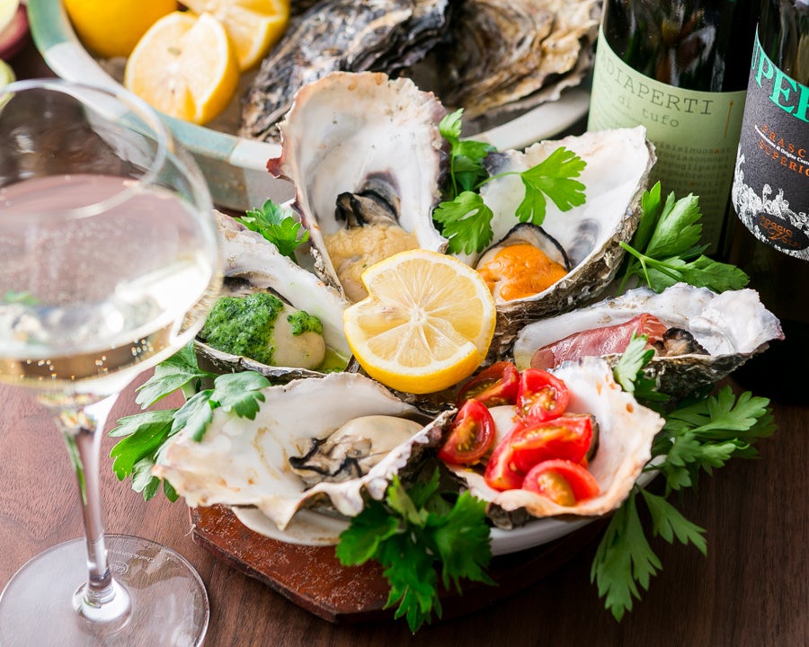 雲丹バター焼き、味噌バター焼き、ガーリックバター焼き、フレッシュトマト焼き、生ハム焼き、醤油焼きの6種類の牡蠣が楽しめます。