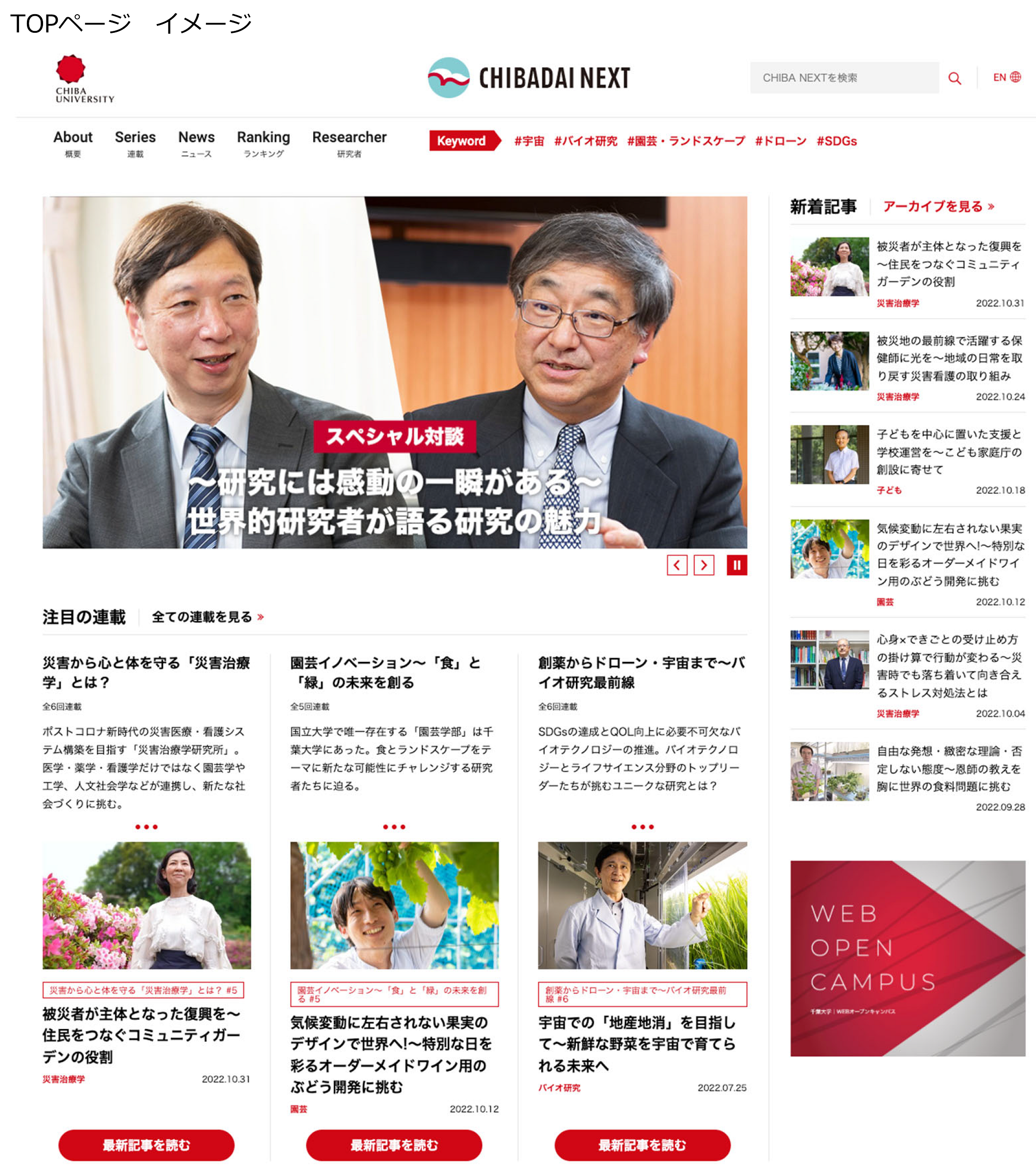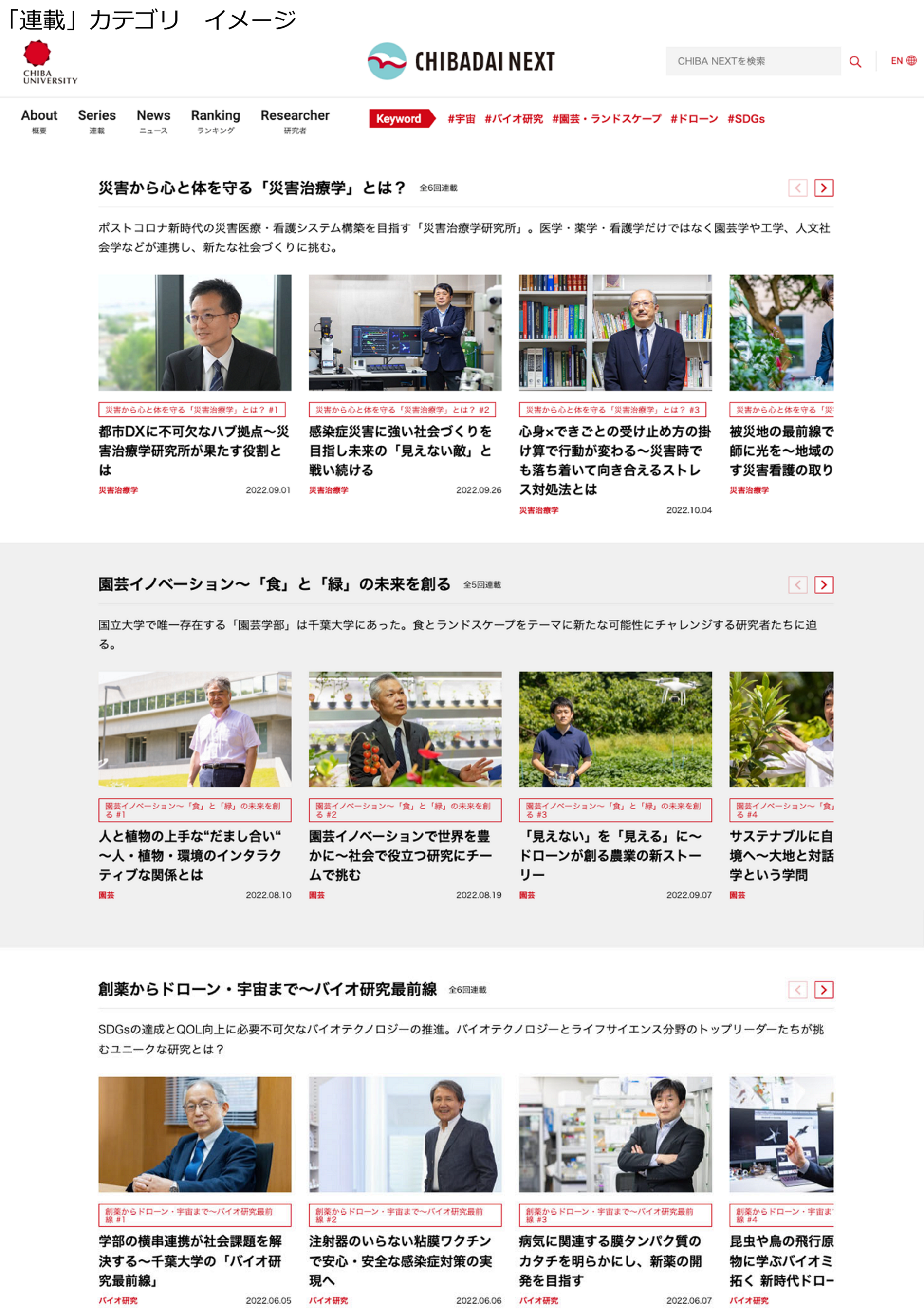 国立大学法人千葉大学(学長 中山 俊憲)は、2022年11月9日(水)より、本学の研究に関する情報発信を行うオウンドメディア「CHIBADAI NEXT(チバダイ・ネクスト)」において、一つのテーマに対してさまざまな角度からの研究内容を紹介する新カテゴリ「連載」の公開を開始しました。