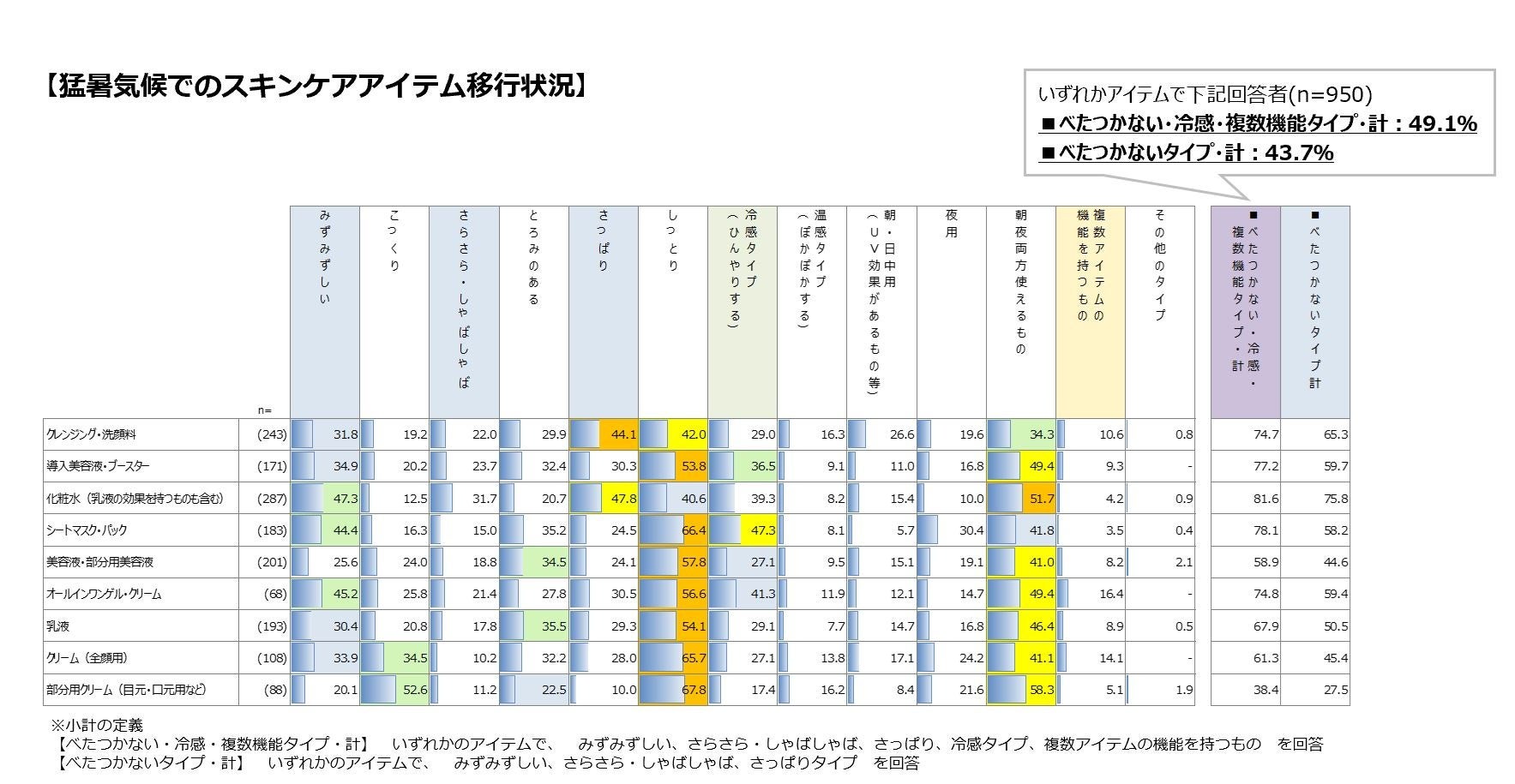更に、スキンケアアイテムの移行状況については各スキンケアアイテムとも、「しっとり」タイプへ変更した率が概ね高いことが分かりました。一方で、各アイテムで「ベタつかない・冷感・複数機能」のアイテムに移行した人は約半数にのぼることが判明。
