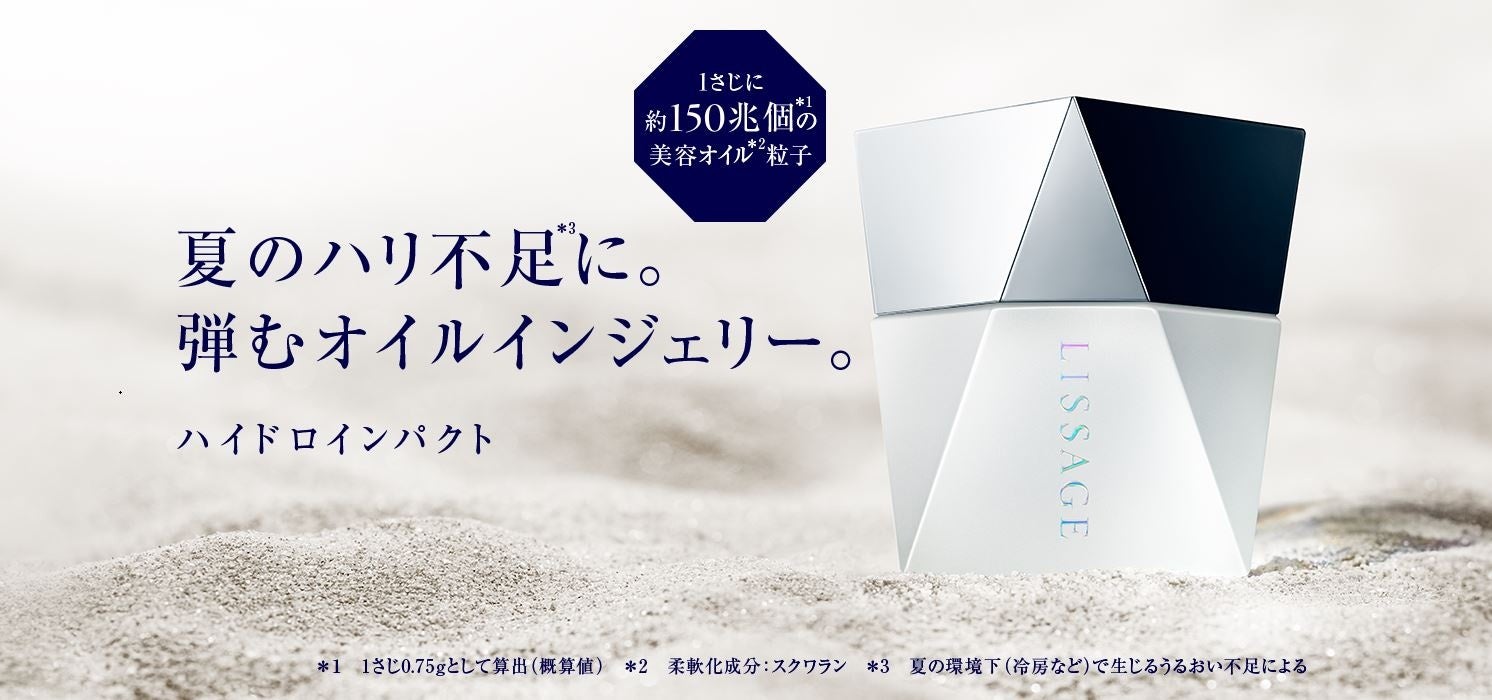 リサージの製剤技術「ナノオイルイン処方」により1さじに約150兆個*1のナノサイズの美容オイル*2粒子を配合することに成功した、リサージ人気のジェル状美容液「リサージ ハイドロインパクト」は、紫外線や冷房などで乾燥しハリも失われがちな肌を、うるおいに満ちたハリ肌に導く、みずみずしい使い心地のオイルインジェリー。