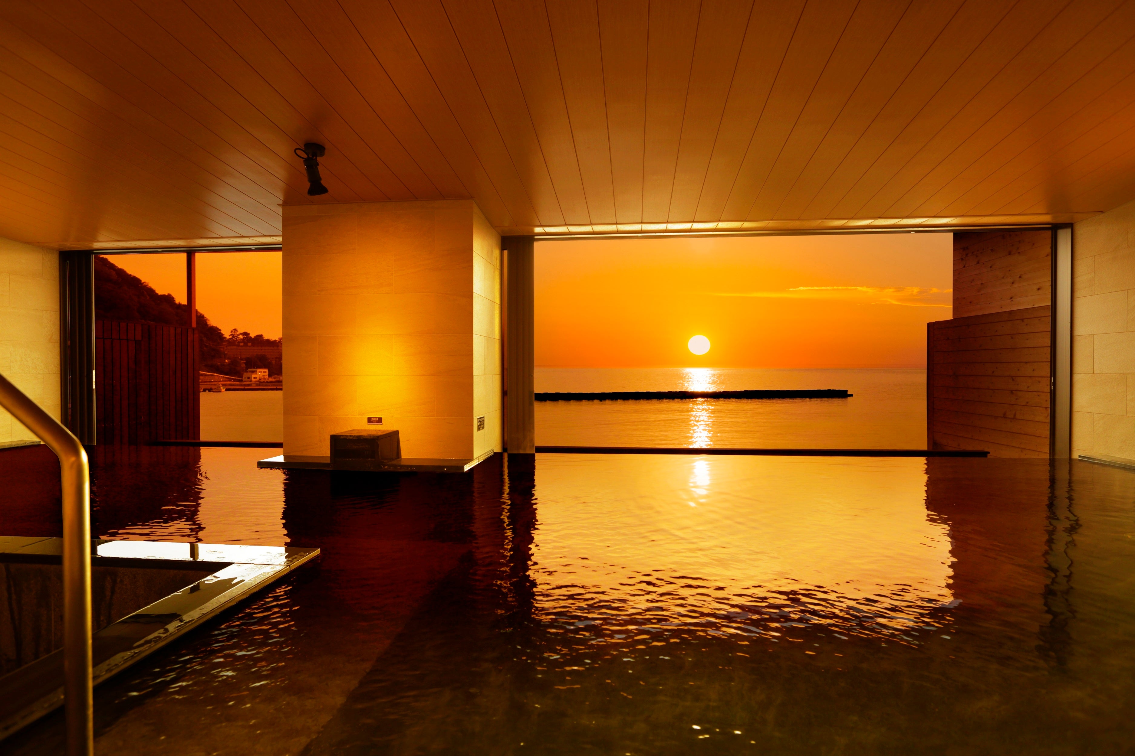 2階の「海の見える大浴場」からは、悠然と広がる駿河湾の美景を一望できます。夕刻になれば、黄金色に染まる景色を眺めながら温泉体験が可能です。(季節・天候・時間により景色は異なります)