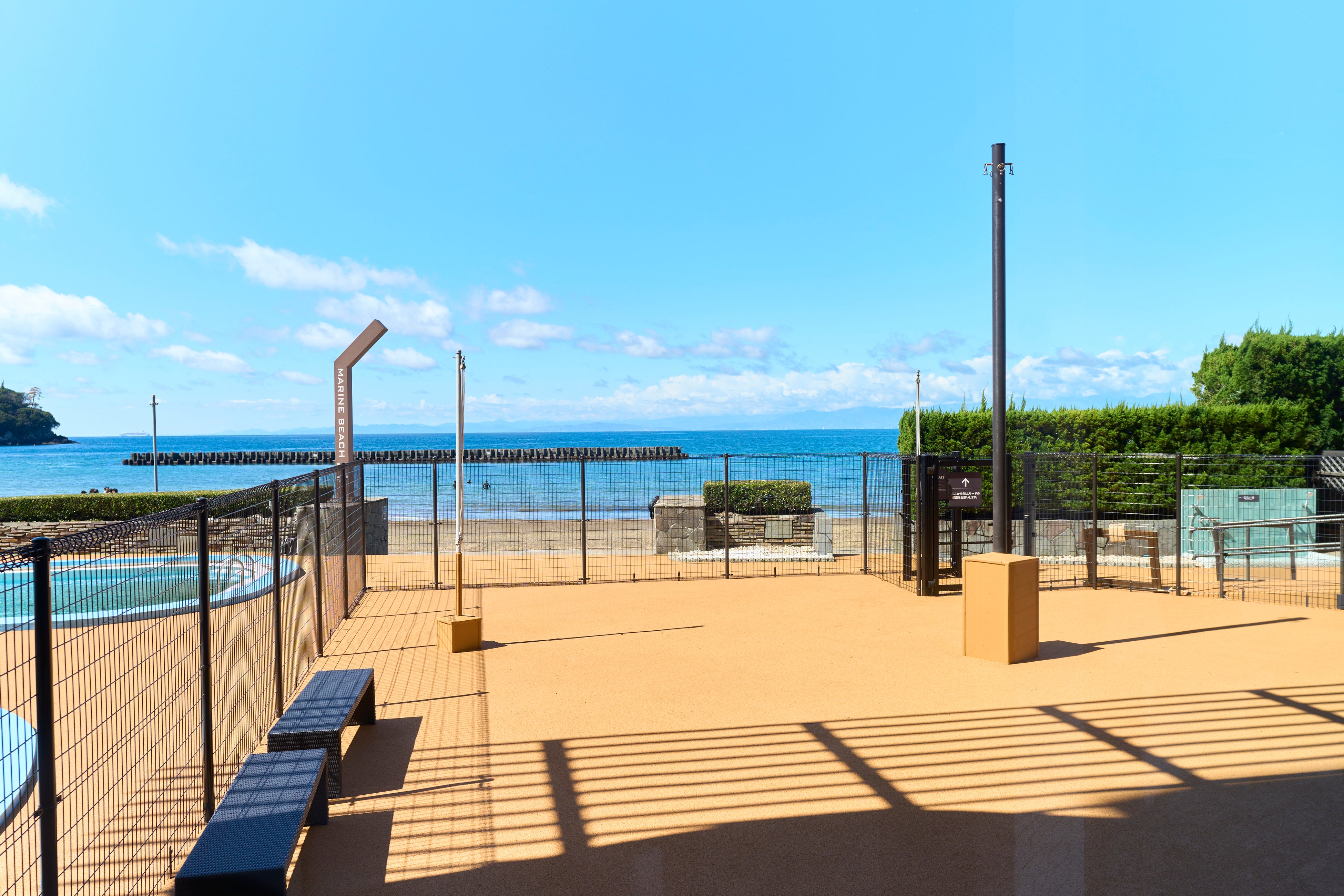 プールデッキの一部を改修し、約200㎡の屋外ドッグランを新設いたしました。わんちゃんも自然の潮風を浴びながら遊ぶことができます。館外へはロビーから出入り可能で、わんちゃん用の足洗い場も設置しております。また、天候を問わず楽しめる約35㎡の屋内ドッグランやセルフグルーミングコーナーなどわんちゃん用の設備が充実しています。