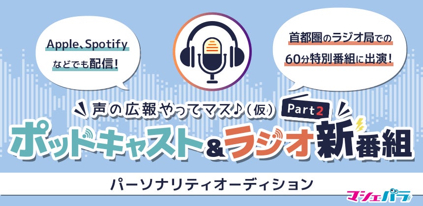 ラジオ制作のプロが手掛ける、ポッドキャスト&ラジオ新番組「声の広報やってマス♪(仮)Part2」では、スポーツをはじめ、さまざまな分野を演者の特性に応じてPRナレーションする番組パーソナリティを選出します。