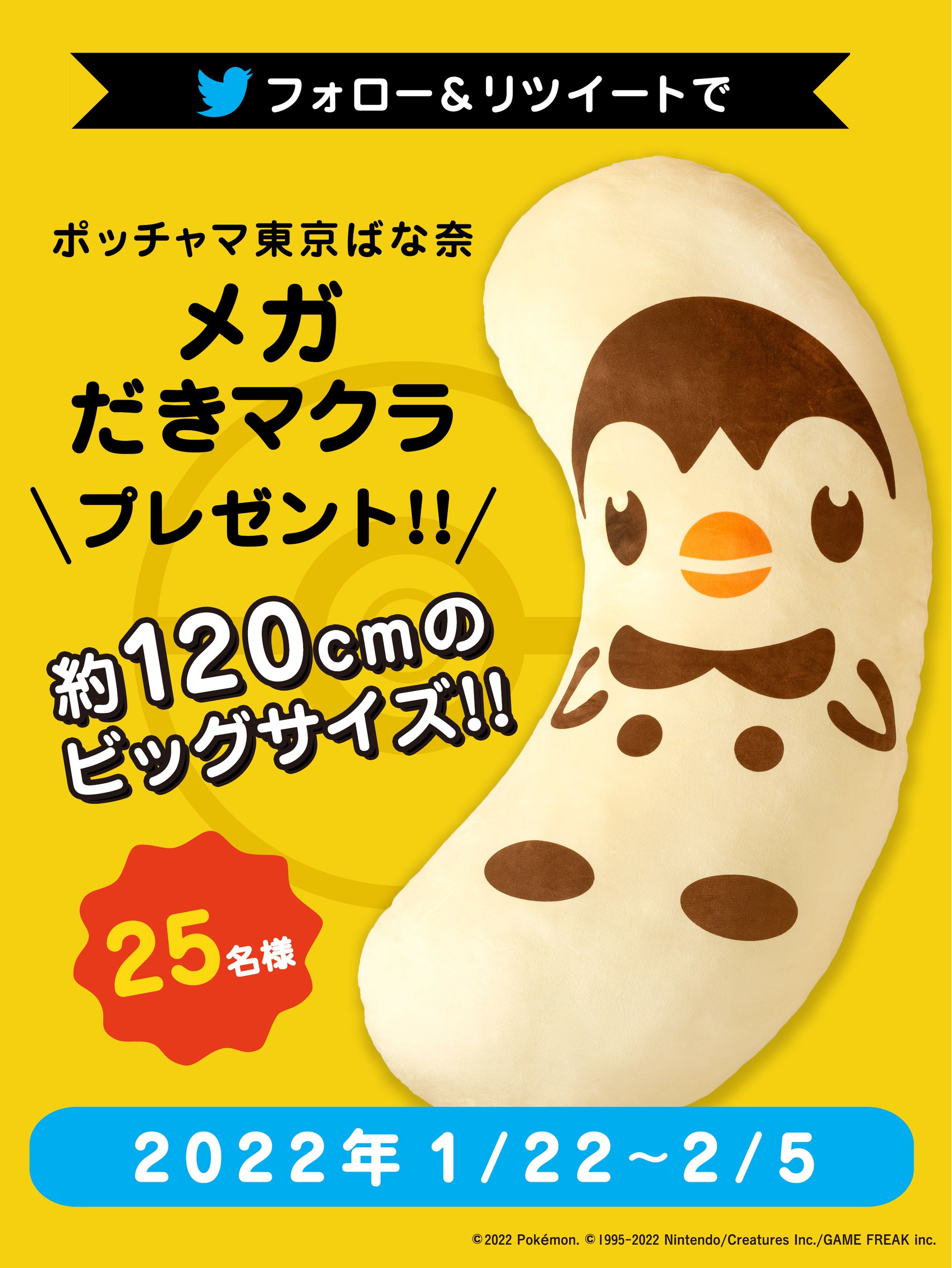 【応募⽅法】期間中に『東京ばな奈』Twitter アカウント(@tokyobanana1991)をフォローし、該当のキャンペーン投稿を「#ポッチャマ東京ばな奈メガだきマクラ」をつけて引用RT。