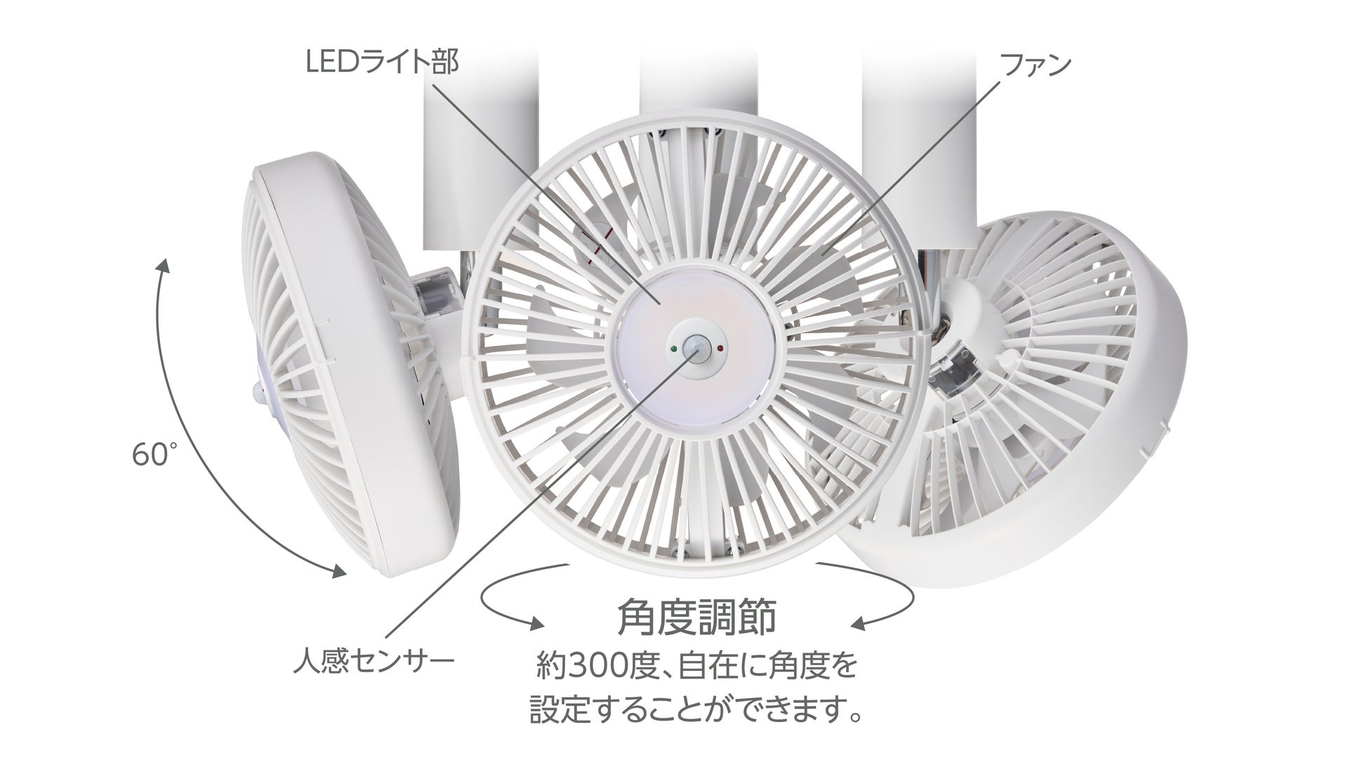 照明とファンの向きは手動で上下60°、水平方向300°と広い範囲で変える事ができます。