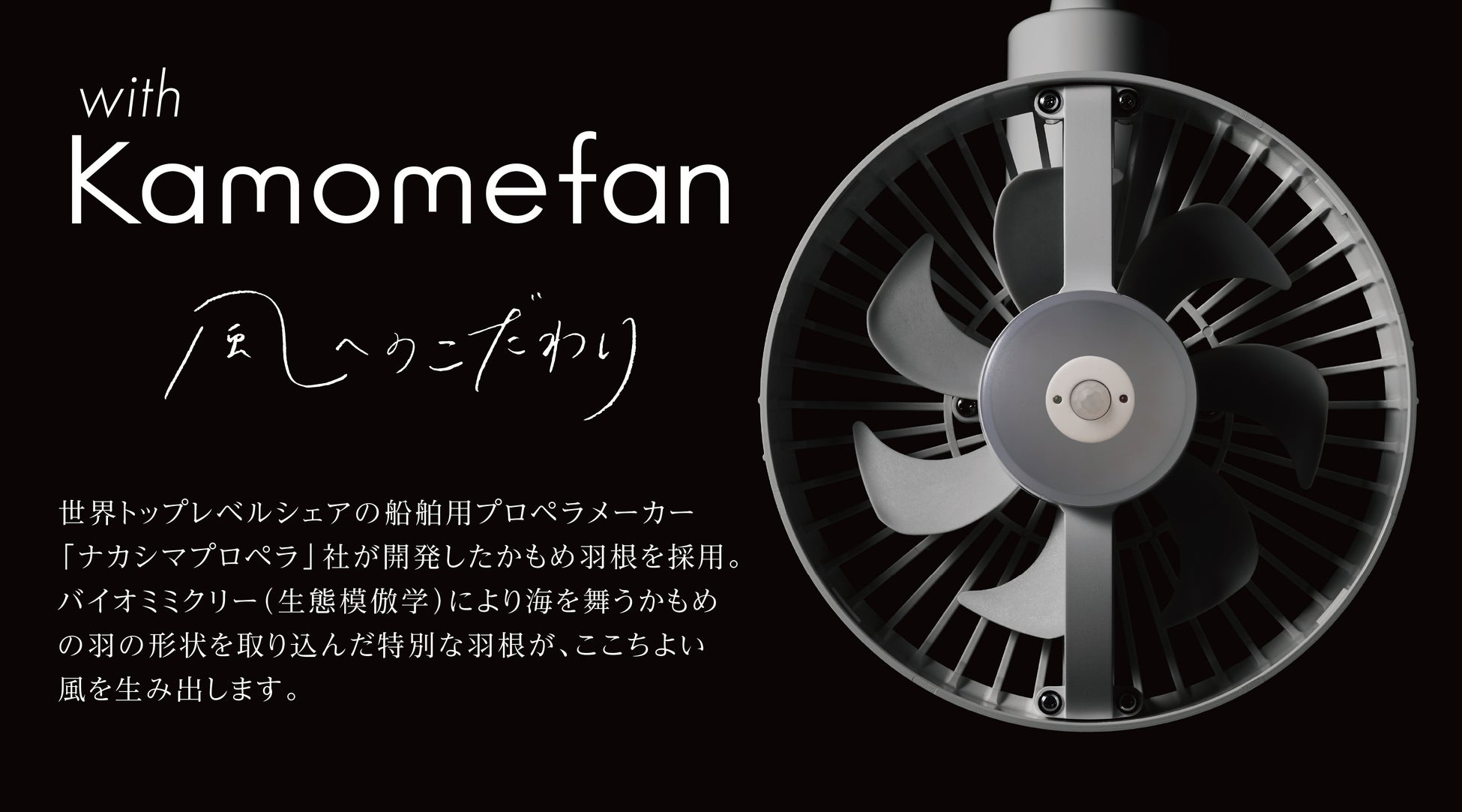 また、ファン部分は他のシリーズ同様に、当社の扇風機「Kamomefan」でも使用している、世界トップレベルシェアの船舶用プロペラメーカー「ナカシマプロペラ」社が開発した「かもめ羽根」を採用することで小さくても十分な風量を届けます。
