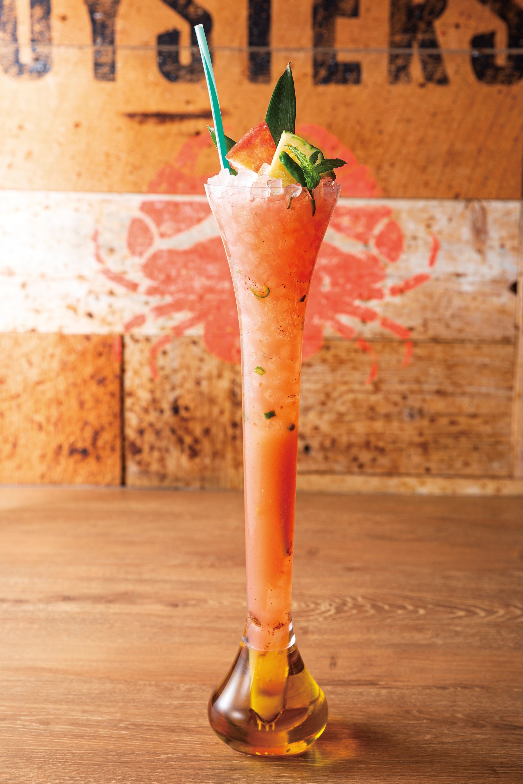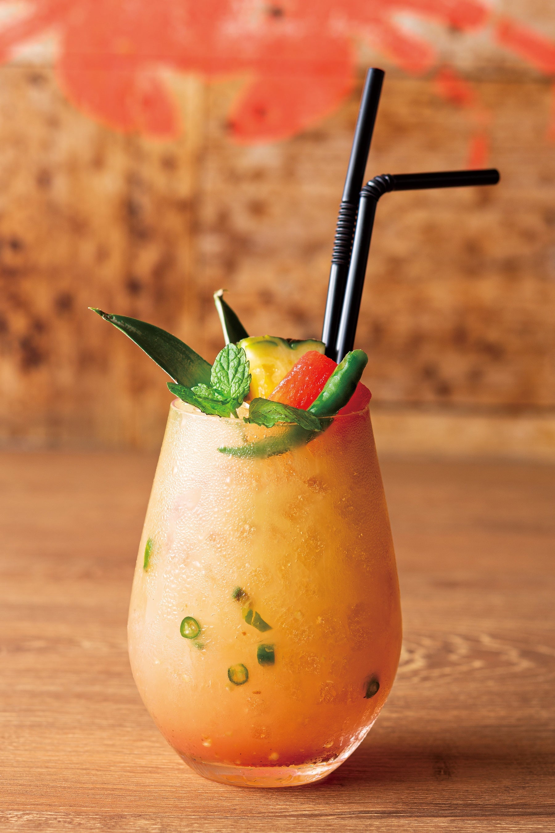 スイカ&パイナップルジュースにテキーラを合わせ、カットしたフルーツをのせた夏らしいカクテル。唐辛子を入れてピリッとスパイシーに。