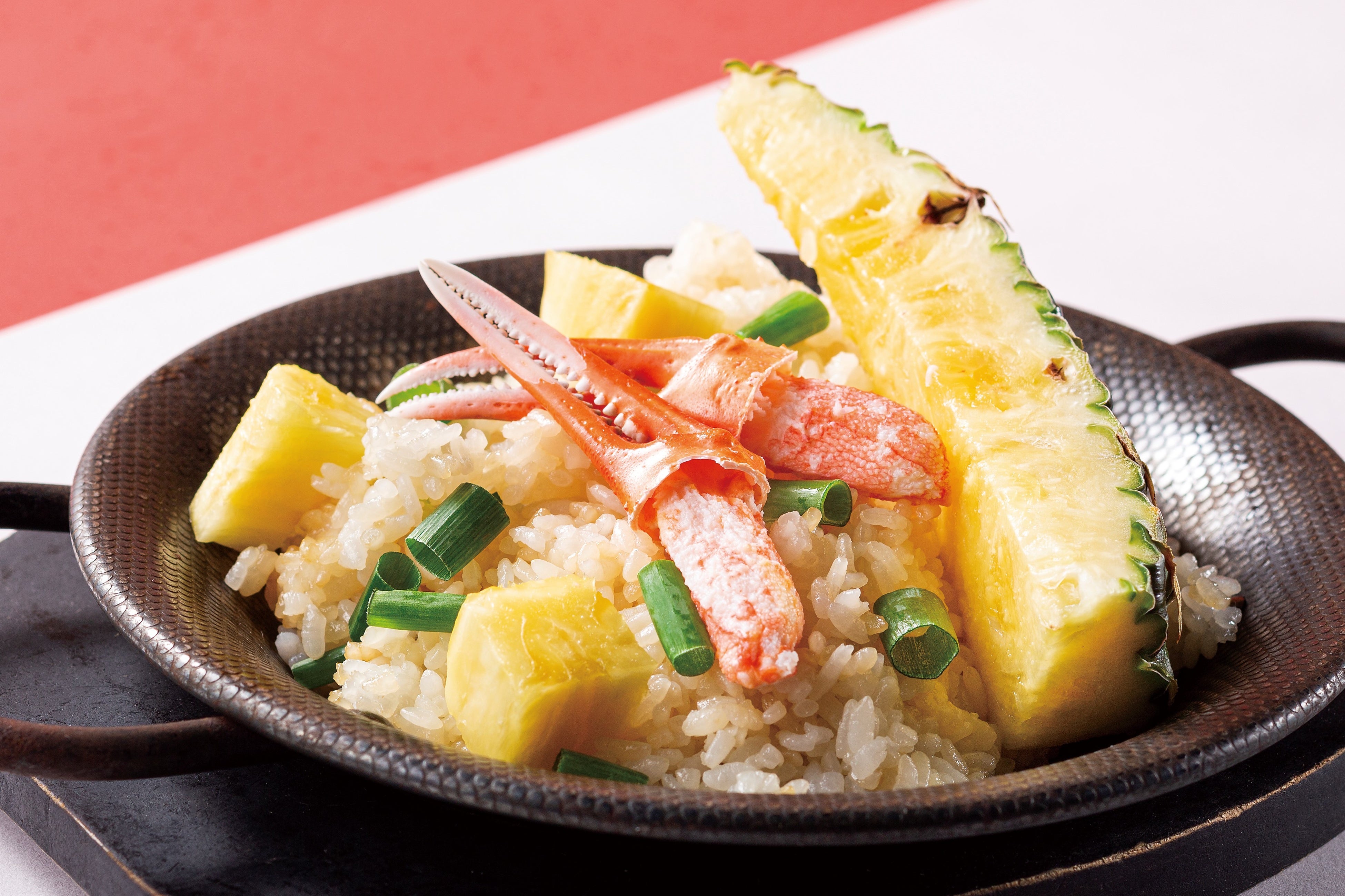 カニの出汁で炊いたピラフにごろっと入ったパイナップルとカニ爪が南国らしいライスメニュー。