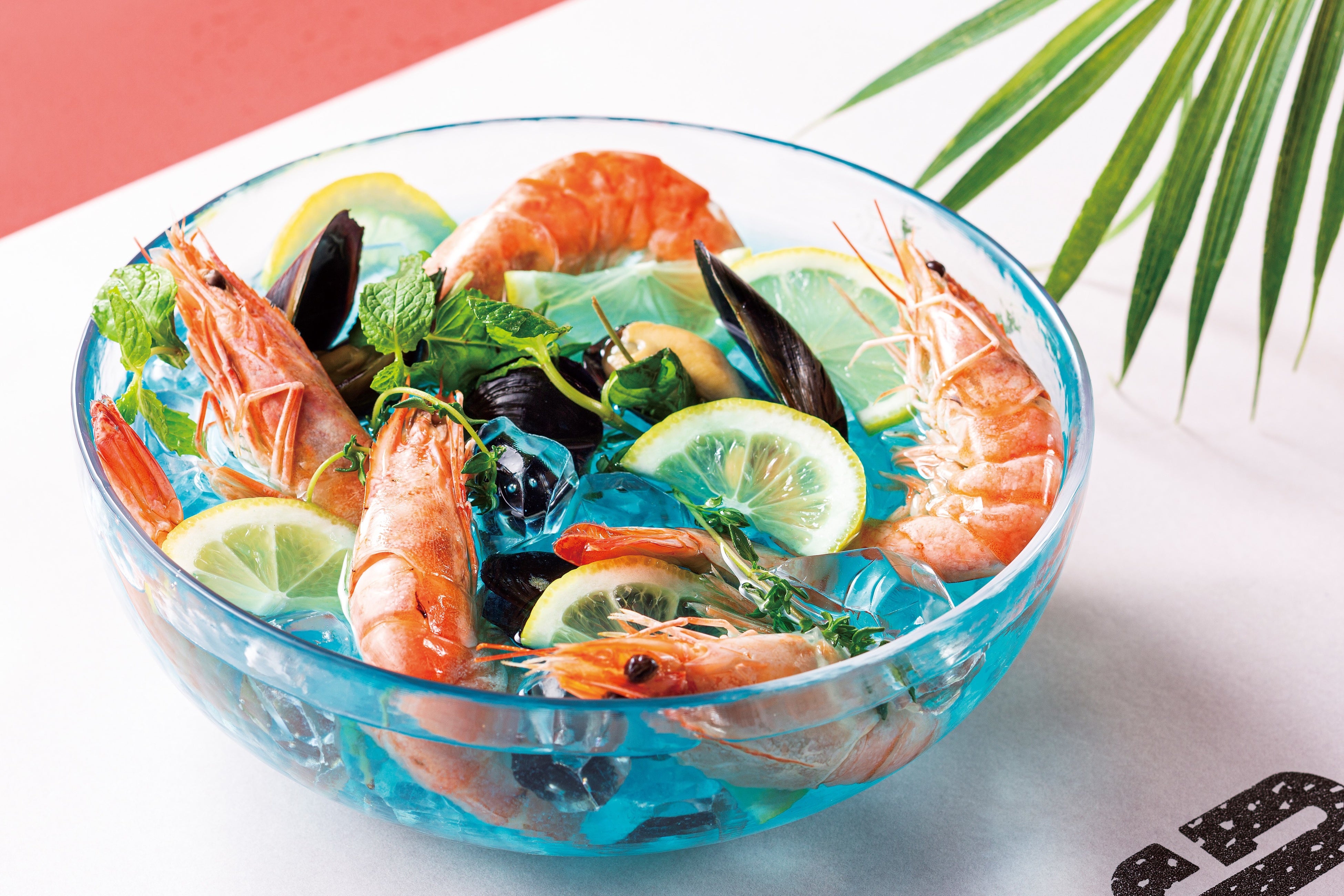 海に見立てたブルーウォーターに、ハーブやレモン、茹でたシーフードが入った一皿。お客様の目の前で茹で立ての海老をお入れします。塩・コショウ・ライムでお召し上がりください。