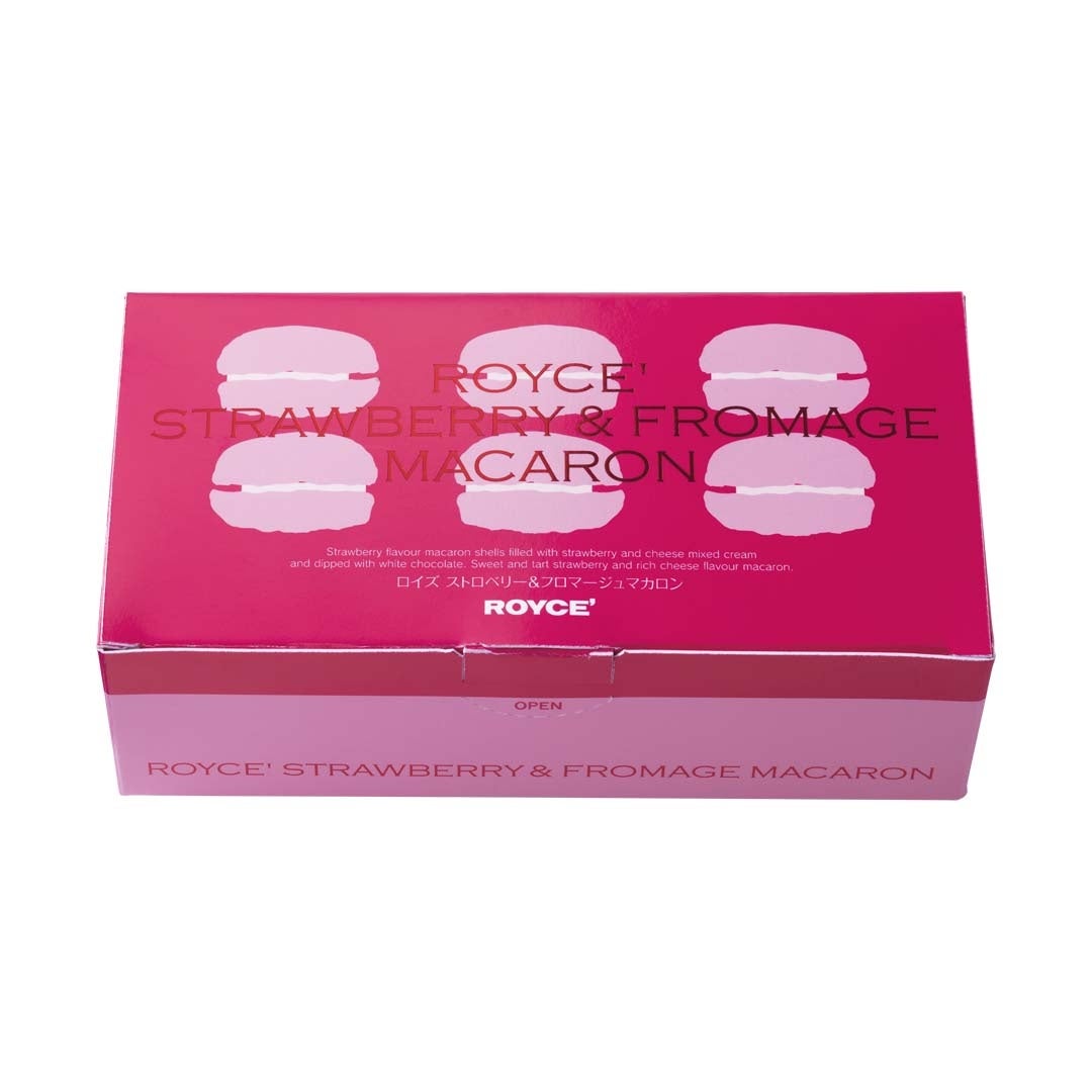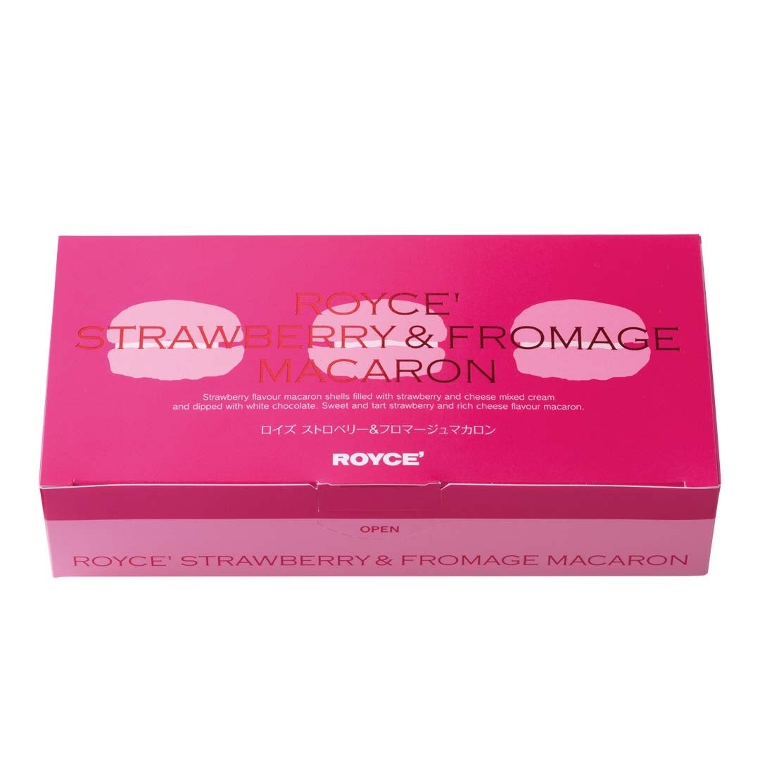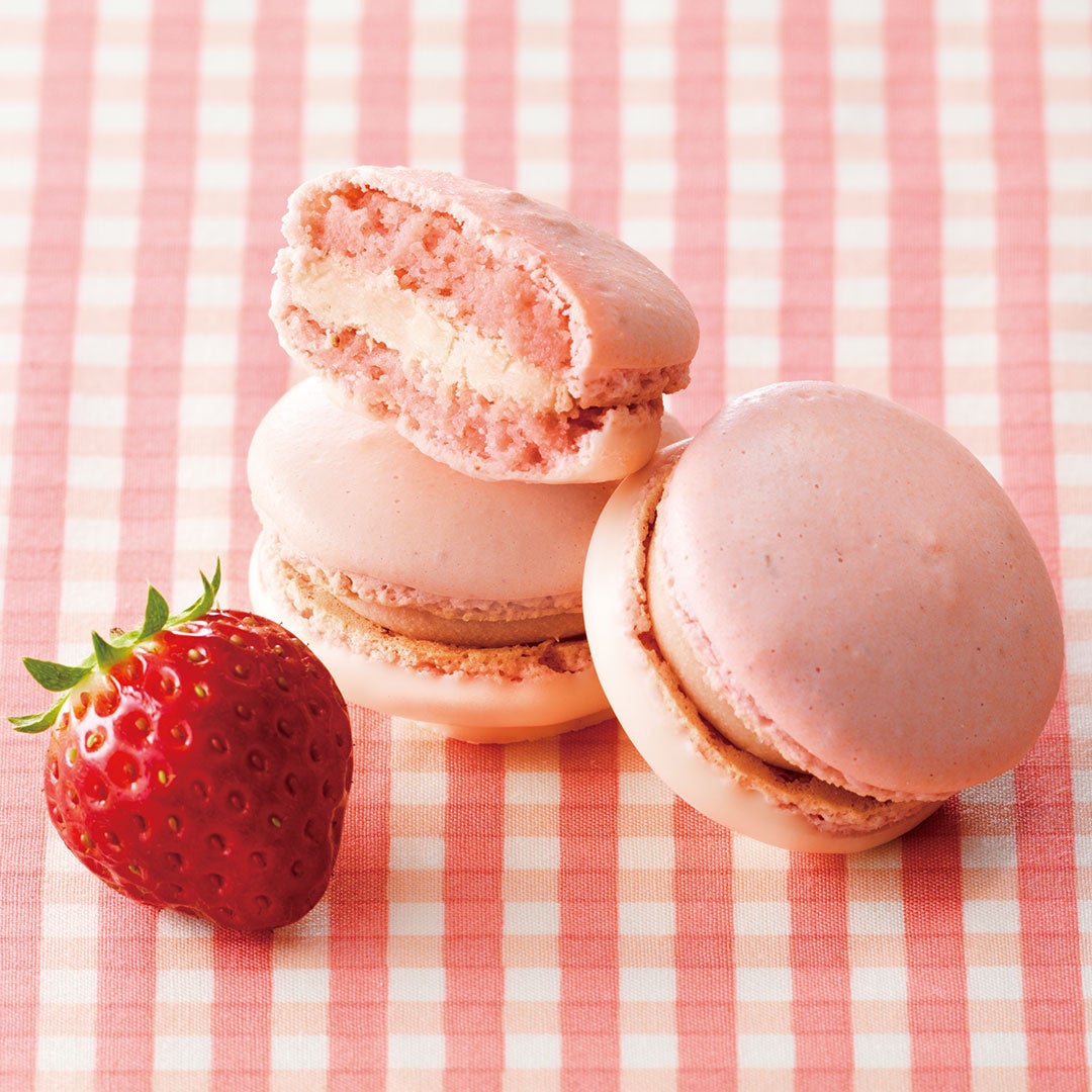 ストロベリー風味のマカロン生地に、ストロベリーにチーズの味わいを加えたクリームをサンドしました。片面には、すっきりとした甘さのホワイトチョコレートをコーティング。ストロベリーとチーズの風味が甘くさわやかに香る、甘酸っぱい春を感じるマカロンです。