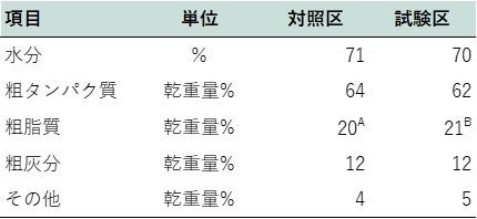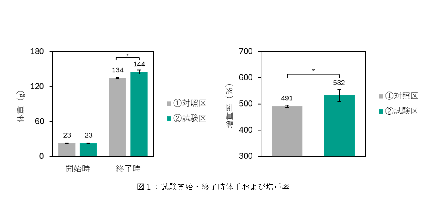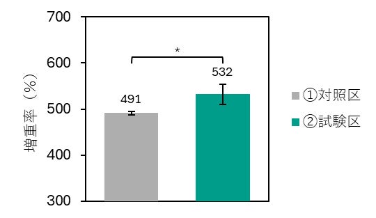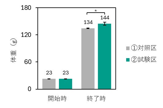 飼育終了時における平均体重および増重率は試験区で有意に高い値となり、試験区の魚は対照区よりも優れた成長を示しました(図1)。また、他の成長関連項目には対照区・試験区間に差は認められませんでしたが、体組成成分では粗脂質含量が試験区で有意に高かったことから(図2)、試験区の魚では体内へのエネルギー源の蓄積を伴い成長した可能性が考えられます。