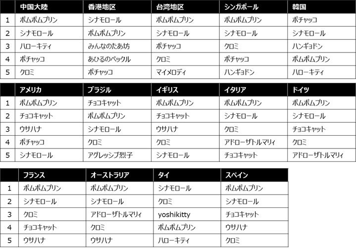 海外順位(国/地域ごと) 中間順位TOP5!「ポムポムプリン」は10の国/地域でも1位にランクイン!