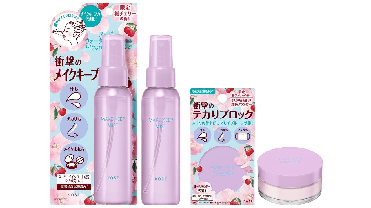 なお、「メイク キープ」シリーズを代表する「メイク キープ ミスト EX +」「メイク キープ パウダー」では、季節に応じた限定品を展開しており、好評を博しています。この反響を受け、2025年1月16日に「メイク キープ ミスト EX + 桜チェリー」「メイク キープ パウダー 桜チェリー」を限定発売します。優しく繊細な八重桜の香りに、チェリーのみずみずしい果実感のあるアレンジを加えた「桜チェリーの香り」を共通して採用。「メイク キープ パウダー」には、桜チェリーパールを配合し、肌にほんのりとした血色感を与えます。パッケージは、桜をイメージしたライトピンクを中心に、背景にライトブルー、差し色にチェリーレッドを加え、手に取るたびに爽やかな春の訪れを感じるデザインとしました。