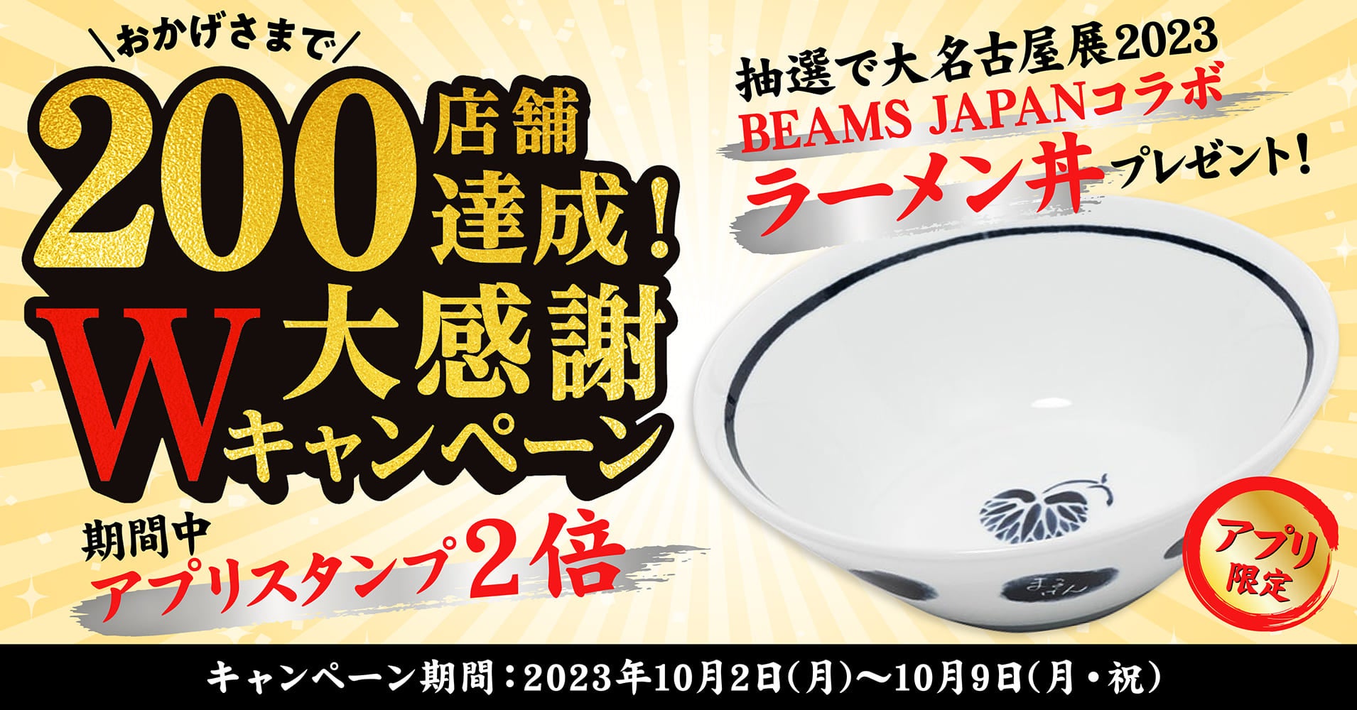 株式会社物語コーポレーション(本社:愛知県豊橋市/代表取締役社長:加藤 央之)が全国201店舗展開中の『丸源ラーメン』は、2023年10月2日(月)より、丸源ラーメンの200店舗達成を記念して、これまで支えていただいたお客様に感謝を込めて「おかげさまで200店舗達成!大感謝Wキャンペーン」を実施いたします。