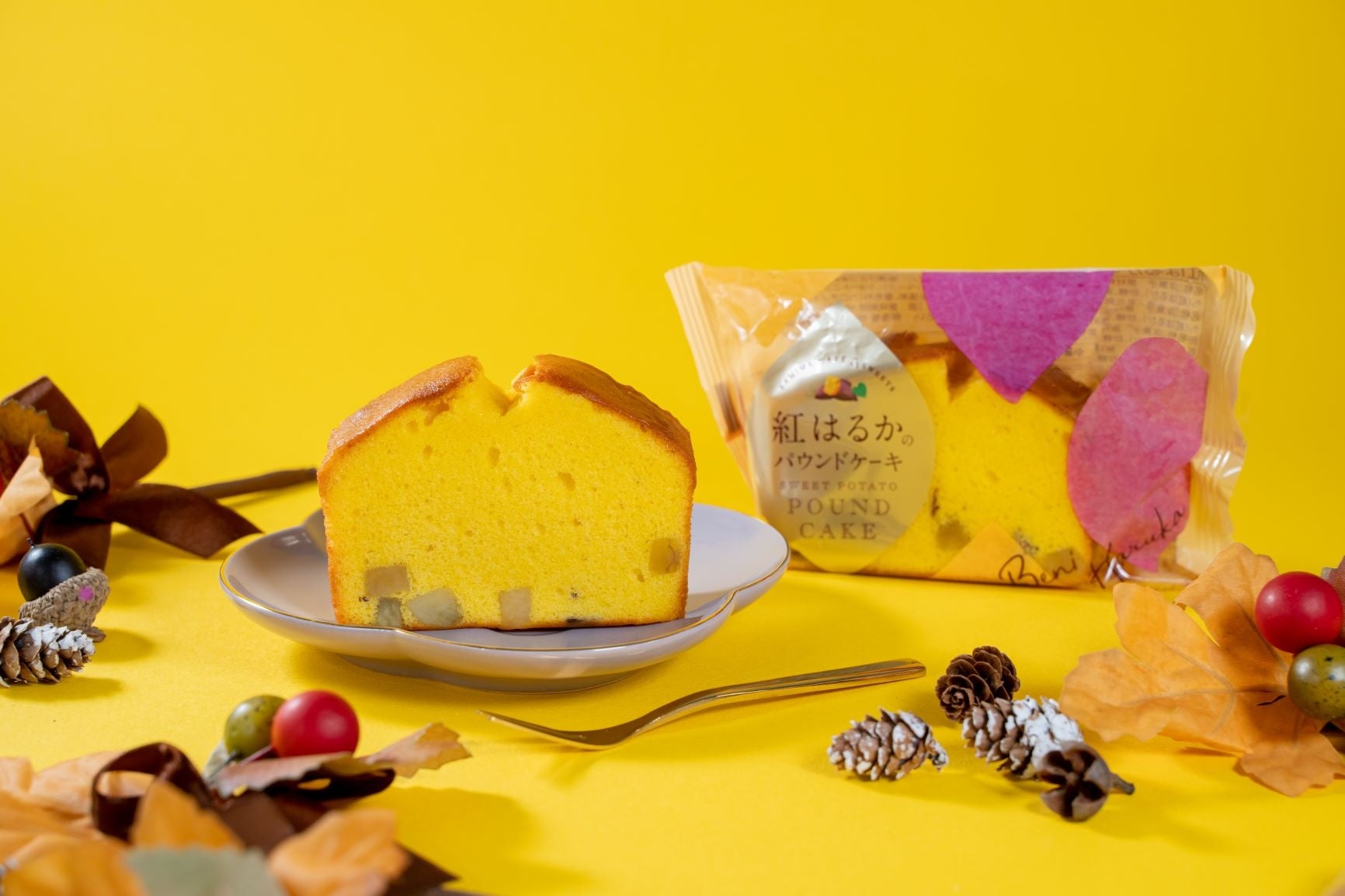【内容】紅はるかのペーストと、具材感としてダイスカットにした紅はるかを生地に練りこみ、さつまいもの甘みが感じられるしっとりとした食感のパウンドケーキに仕上げました。