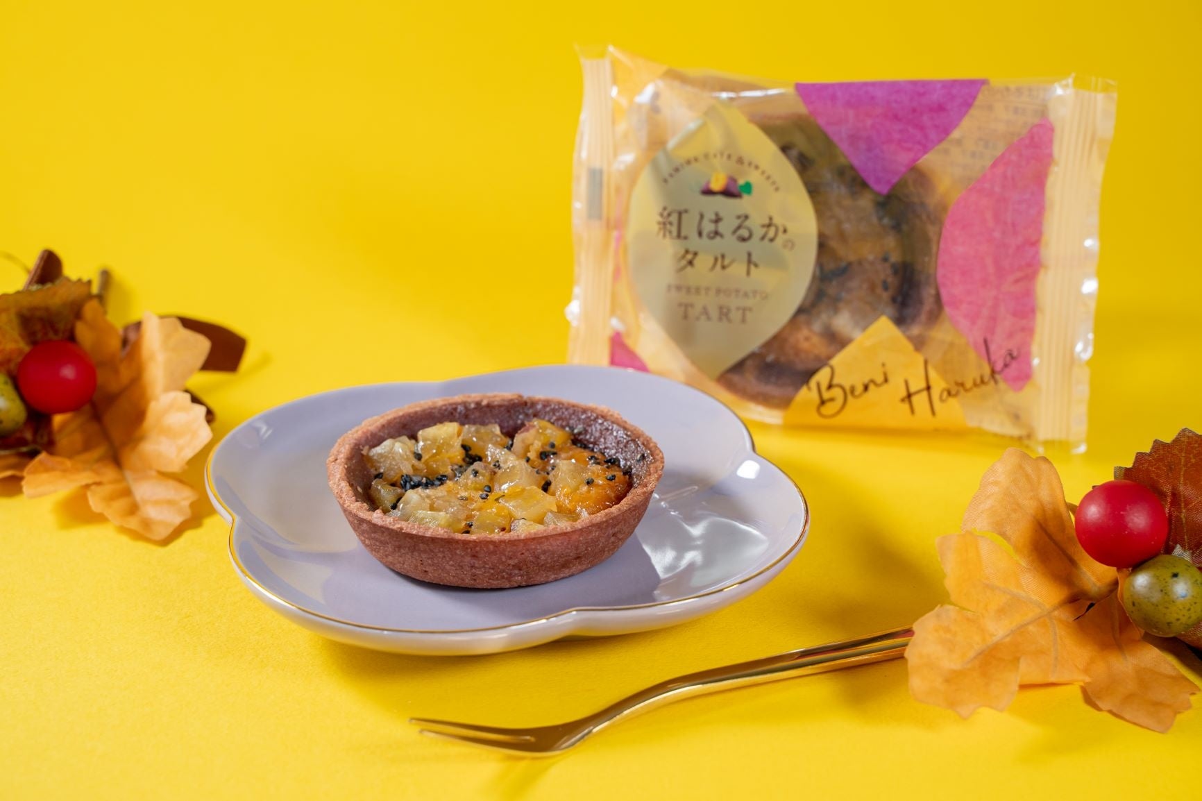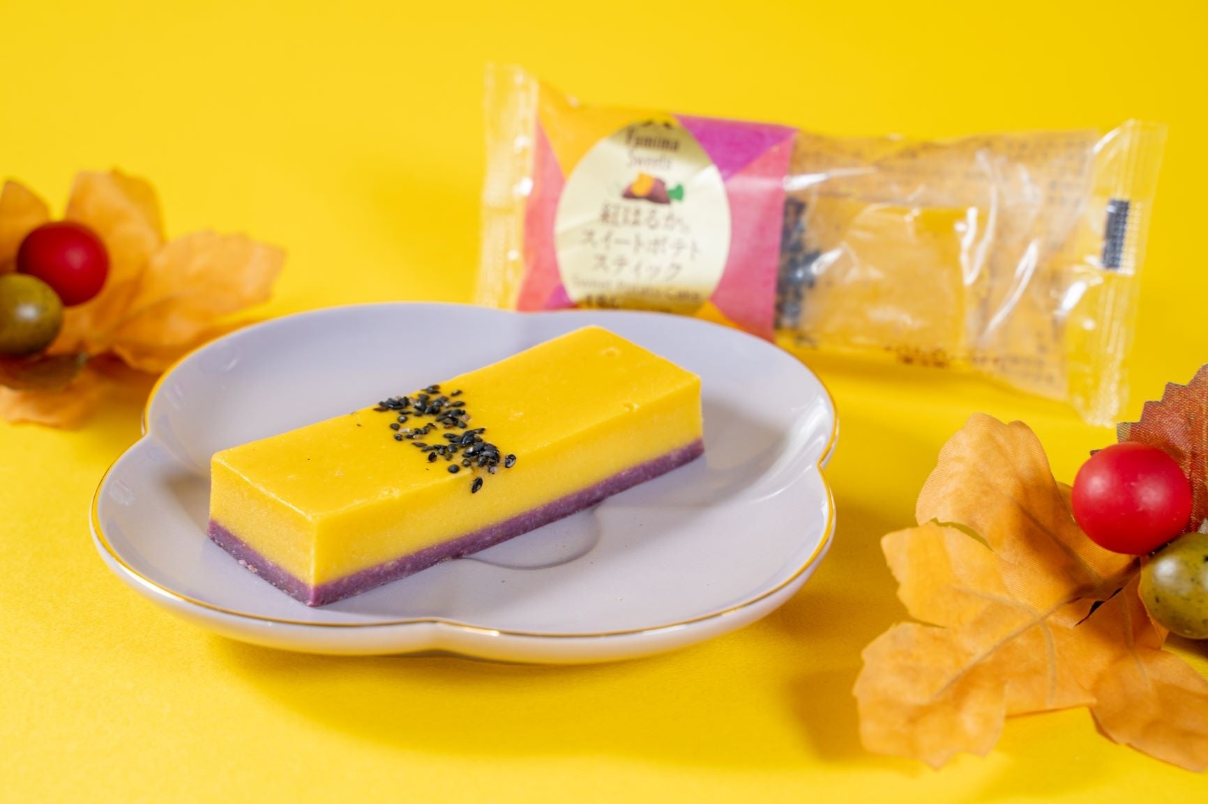 【内容】紅はるかのさつまいもペーストを配合した、スイートポテトのような「ねっとり」食感が特徴のスティックケーキです。タルト生地はさつまいもの皮をイメージした赤紫色で、見た目も楽しい商品です。