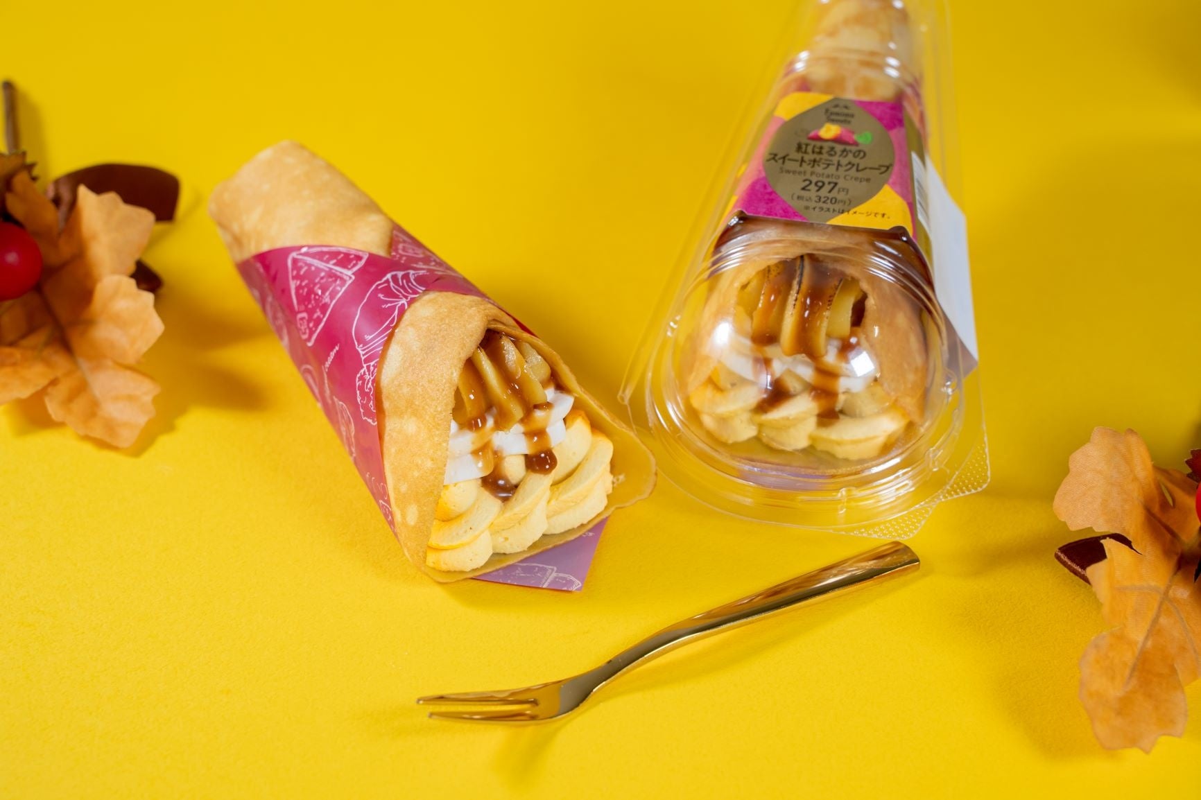 【内容】「もっちり」とした食感が特長のクレープ生地に、たっぷりのクリーム(練乳入りホイップ・さつまいもクリーム)と表面をあぶった、風味豊かで香ばしい自家製スイートポテトを包みました。