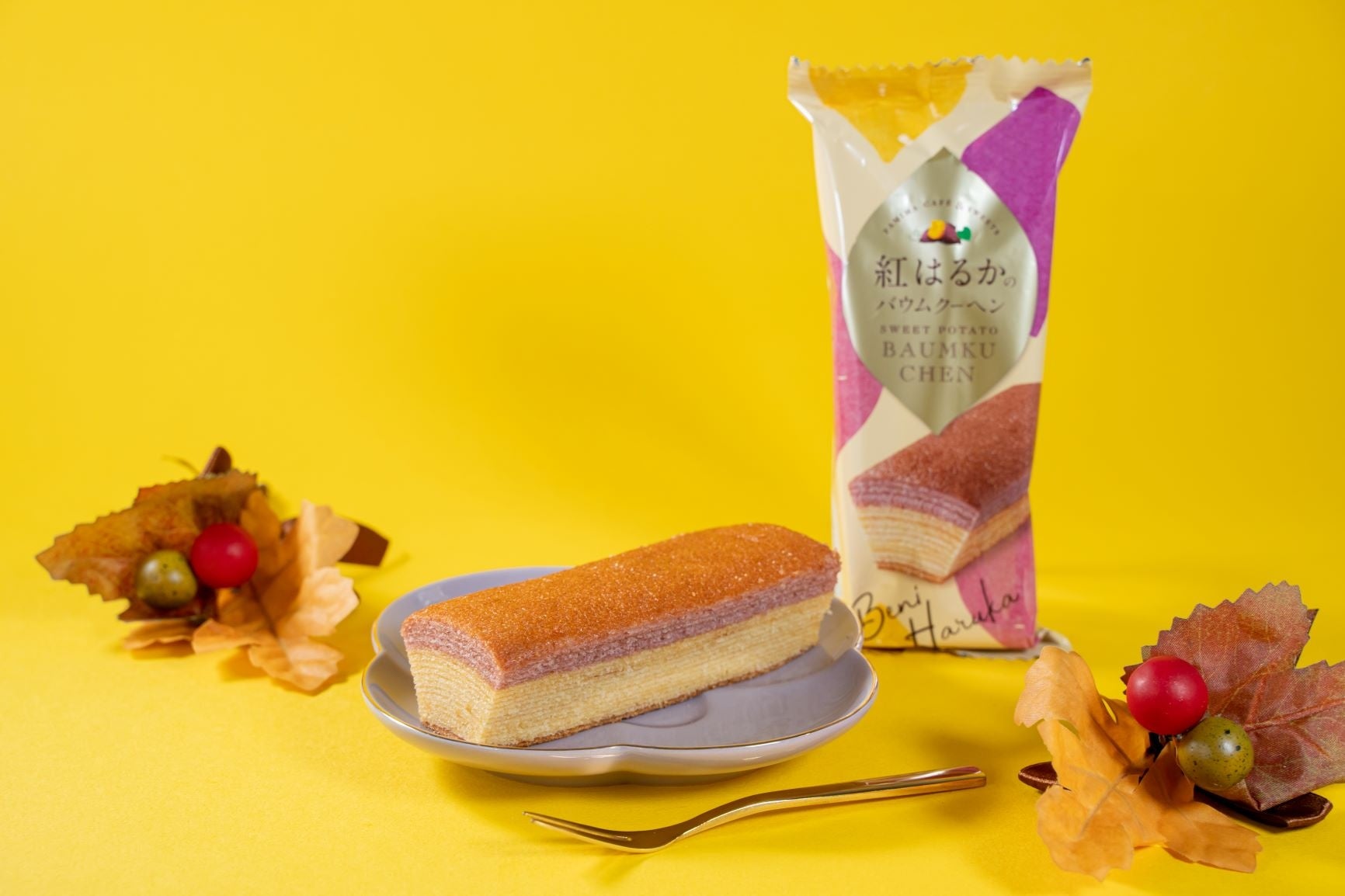 【内容】紅はるかのペーストを使用し、さつまいもの見た目を模した2層構造に、紅はるかの特徴である甘さを活かした「ふんわり」食感が特徴のバウムクーヘンです。