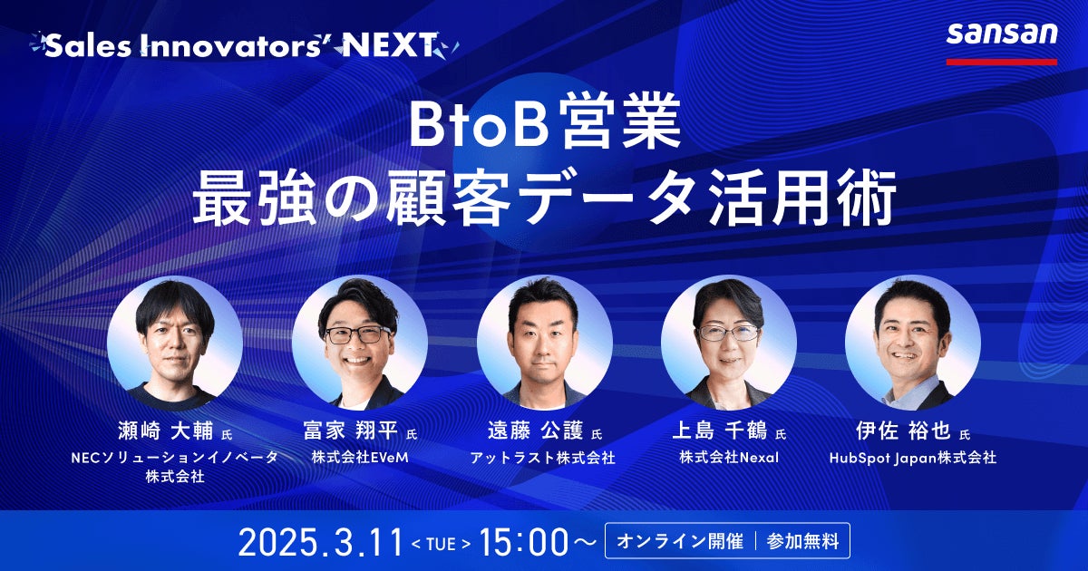働き方を変えるDXサービスを提供するSansan株式会社は、「Sales Innovators’ NEXT」を2025年3月11日(火)にオンラインで開催します。本イベントでは、営業DXの最前線で活躍するビジネスリーダーを招き、データ活用による営業力強化や営業組織の変革について議論し、営業革新を起こすためのヒントを参加者にお届けします。