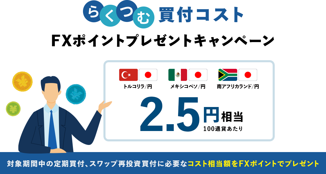 条件を満たしたお客様に、キャンペーン期間中の定期買付およびスワップポイント再投資による買付コスト相当額をFXポイントにて進呈いたします。
