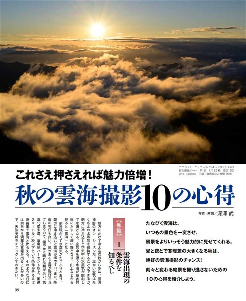 たなびく雲海はいつもの景色を一変させ、風景をよりいっそう魅力的に見せてくれます。昼と夜とで寒暖差の大きくなる秋は、絶好の雲海撮影のチャンス! 刻々と変わる絶景を撮り逃さないための「10の心得」を公開します。解説は、風景写真家の深澤武さん。