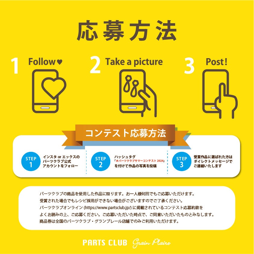 STEP3:ハッシュタグ 【 #パーツクラブサマーコンテスト2024 】をつけてInstagramまたはXへ投稿。