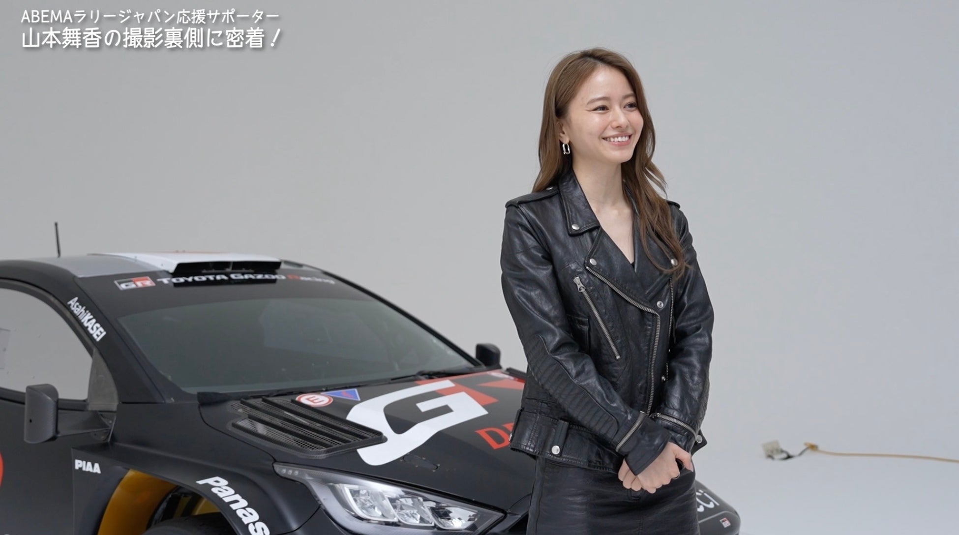 このたび公開された動画では、山本さんの「ABEMAラリージャパン応援サポーター」としての初仕事現場に密着しました。まずはキービジュアルの撮影からスタート。黒のラリーカーの横で、同じく黒色のレザージャケットとミニスカートを着用した山本さんが様々なポーズをとり、撮影は順調に進んでいきました。