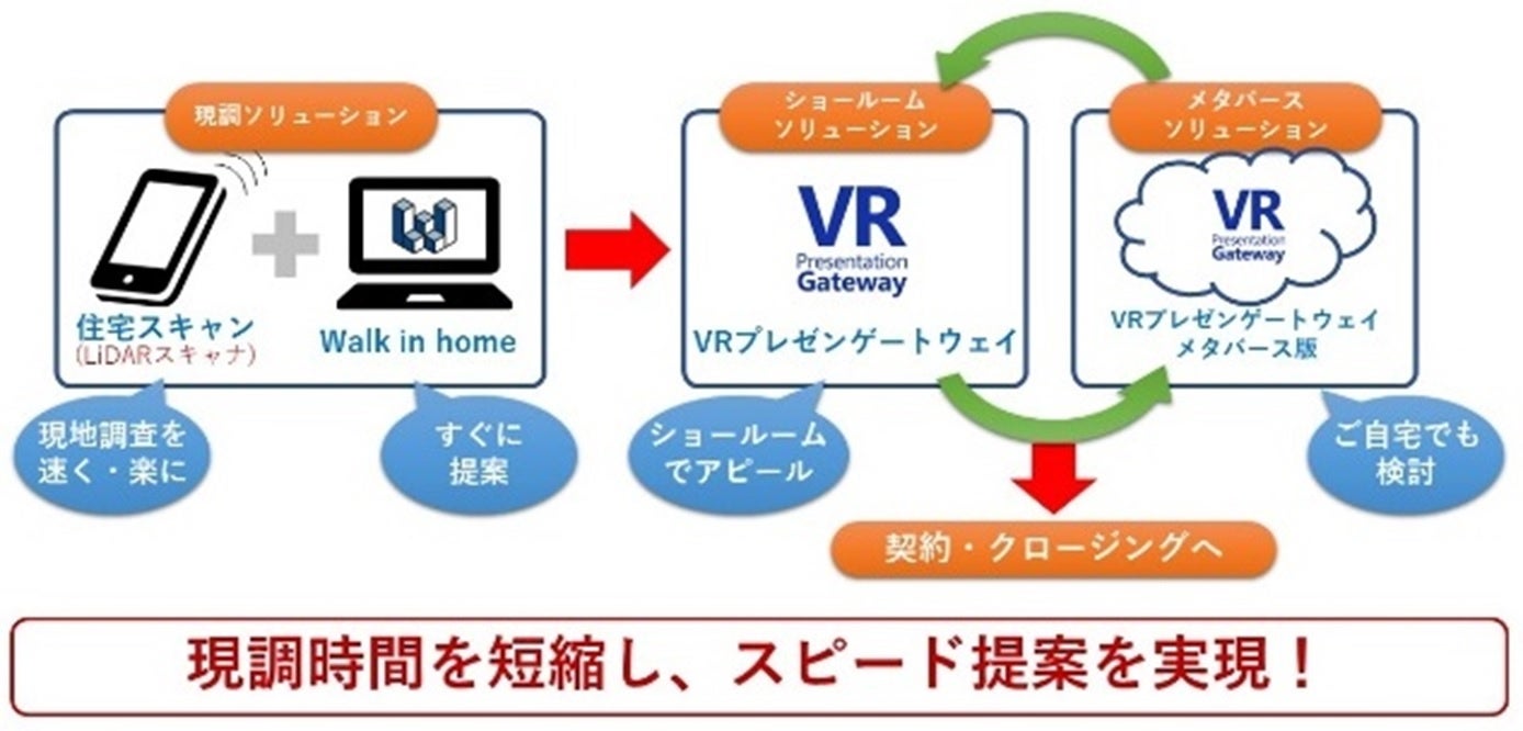 最新のiPad*3 には、レーザー光を照射して、その反射光の情報をもとに、対象物の形状・位置や対象物までの距離を三次元で計測できる「LiDARスキャン」機能が搭載されています。今回、この機能で、リフォームする住宅内部を3Dデータ化し、プレゼンテーションソフト「Walk in home 2022」以上(株式会社DTS)と「VRプレゼンゲートウェイ」を連動させて、リフォームプランの作成からウォークスルーVRの提案までを迅速に実現するソリューションを紹介します。リフォームの商談における施主の利便性を高め、住宅事業者のDXを推進する一連のソリューションを展示会来場者に訴求します。