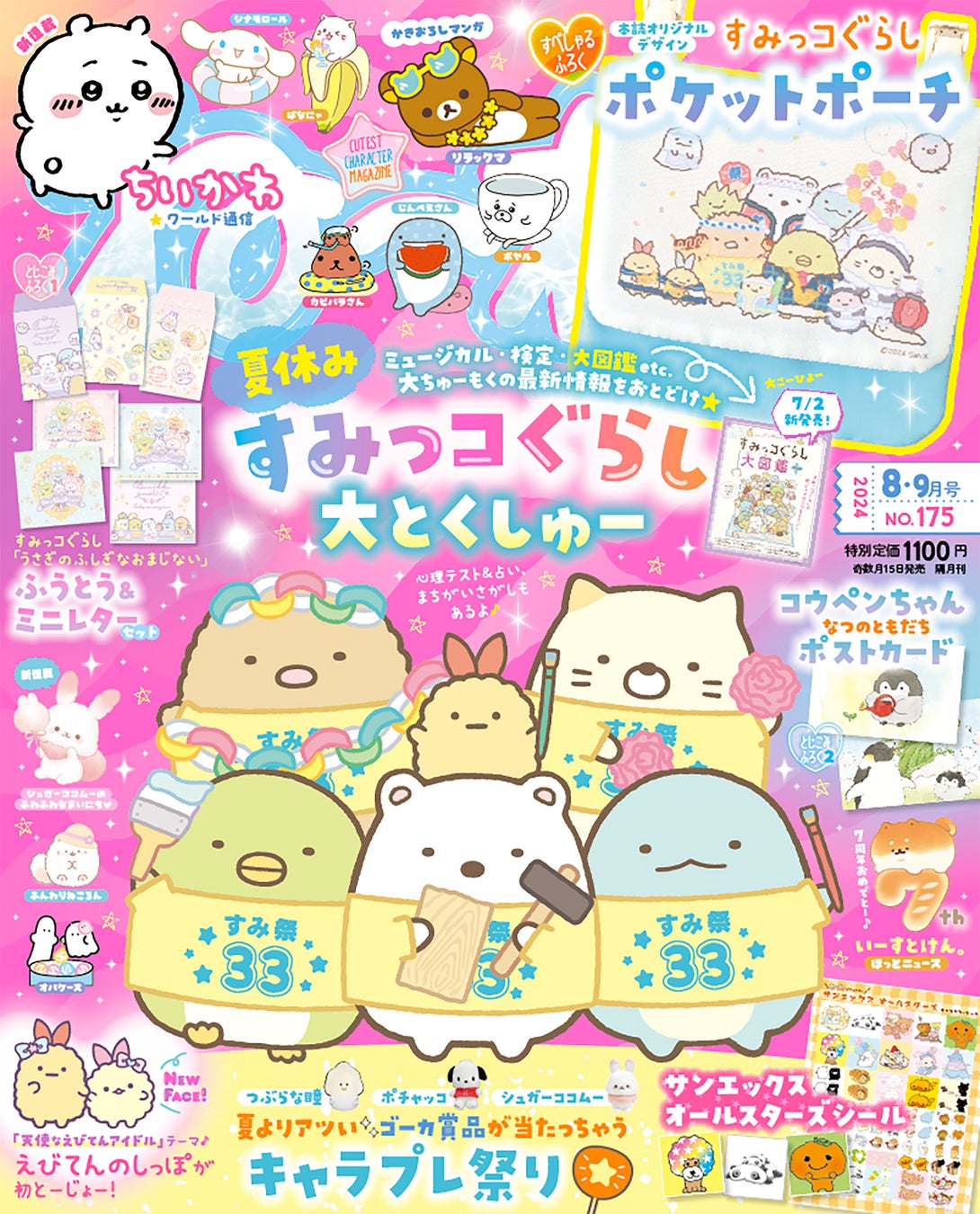 スペシャル付録のポケットポーチをはじめ、新テーマの「天使なえびてんアイドル」や、まちがいさがし、占いやとじこみふろくなど、すみからすみまですみっコぐらしがもりだくさん!!