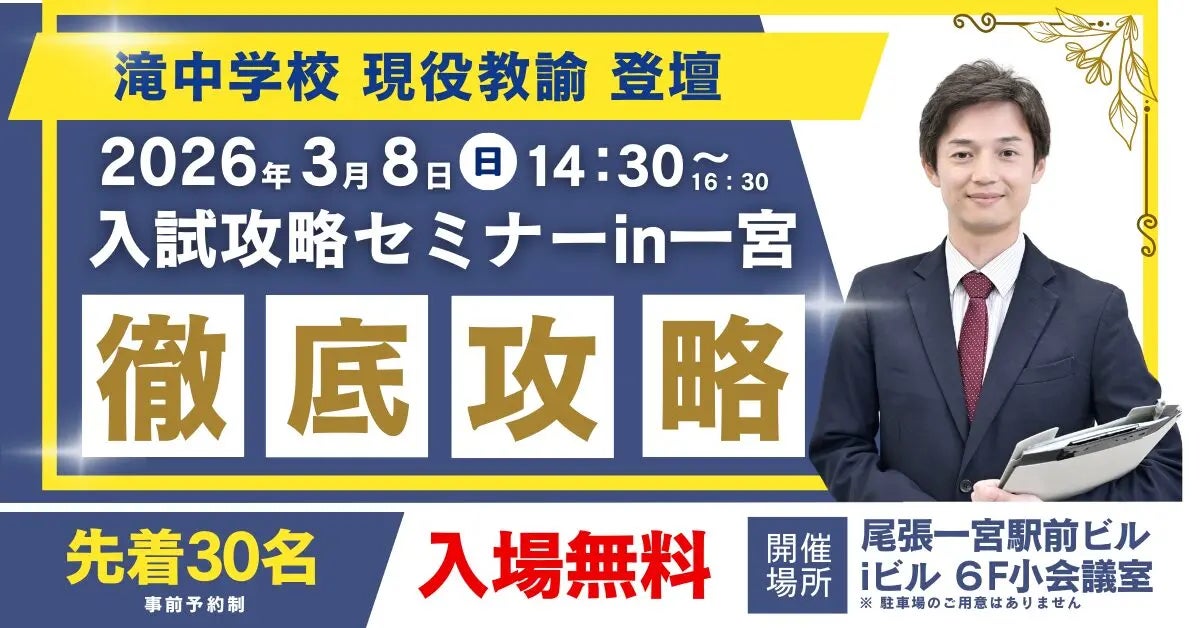 一宮校では開校を記念し、特別なイベント「滝中学校入試攻略セミナー」を開催。学校が「求める生徒像」や、「合否を分ける1点」の守り方などを徹底解説いたします。ぜひお越しください。