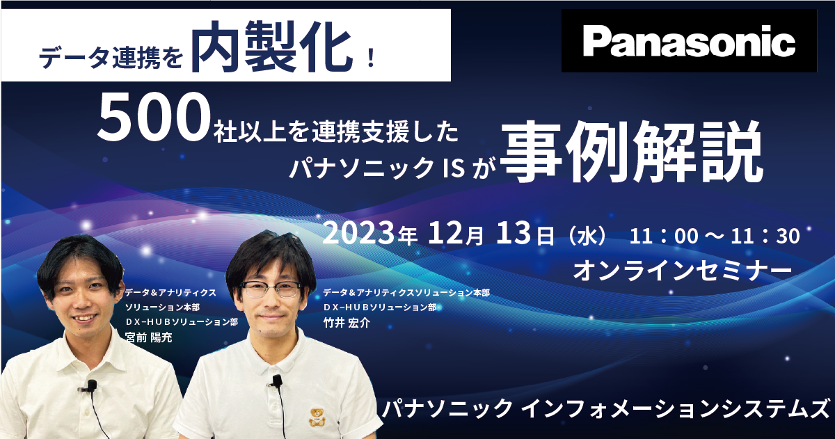 パナソニック インフォメーションシステムズ株式会社は、2023年12月13日(水)、オンラインセミナー『データ連携を内製化!500社以上を連携支援したパナソニックISが事例解説』を開催します。