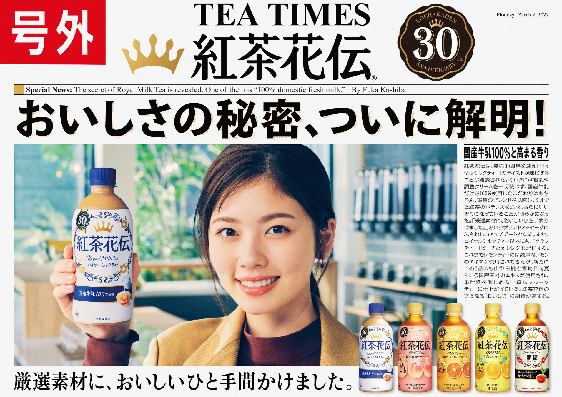 リニューアルにあわせて、「紅茶花伝」のおいしさの秘密をニュース形式でお届けする新キャンペーンを開始し、女優・小芝風花さんを起用した新CMを全国放映します。CM以外にもデジタル広告、店頭施策などを積極的に展開し、30周年を迎える「紅茶花伝」のおいしさを発信していきます。