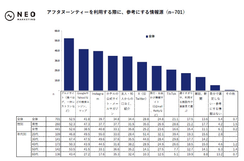アフタヌーンティーを利用する際に参考にする情報源について聞いたところ、「グルメサイト(食べログ、一休レストランなど)」が最も高く、「GoogleやYahoo!などの検索エンジン、マップ」「Instagram」が続く結果となりました。